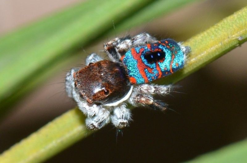 У самцов верхняя часть брюшка декорирована ярким узором. Цвета варьируются, а каждый рисунок уникален.