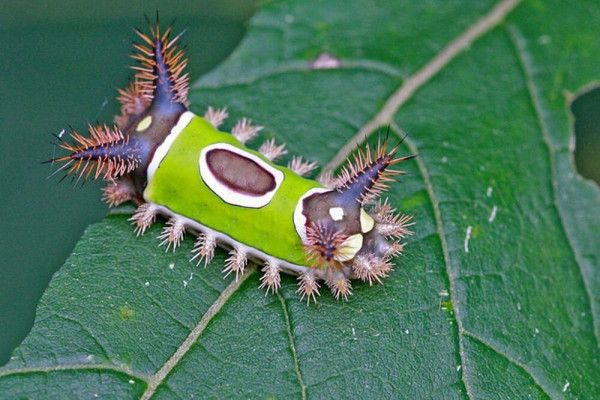 Гусеница этой бабочки семейства слизневидок зелёная по центру и коричневая по обоим концам тела. В центре находится коричневое пятно с белой окантовкой, похожее на седло.