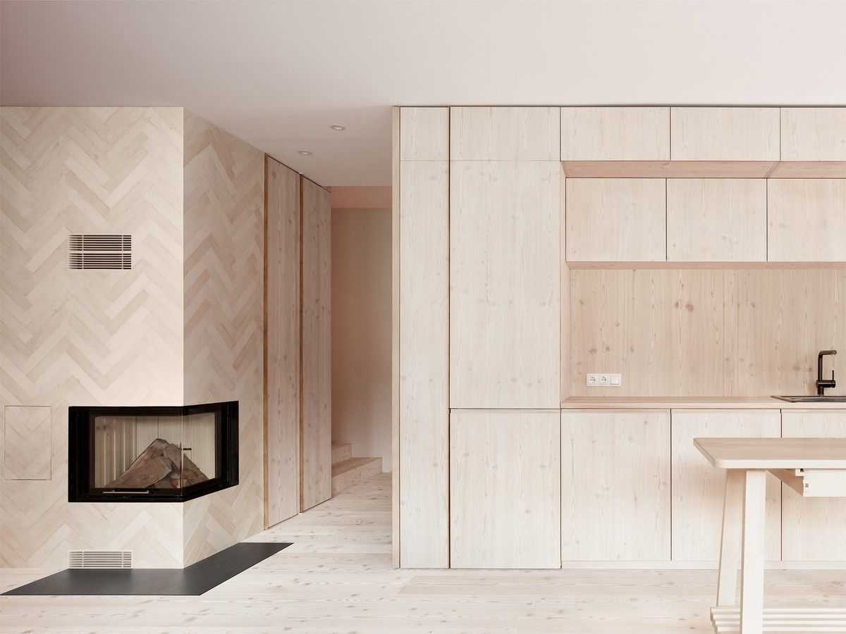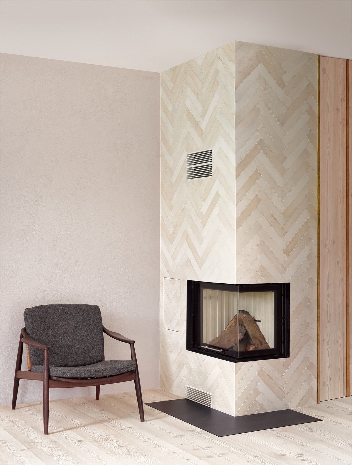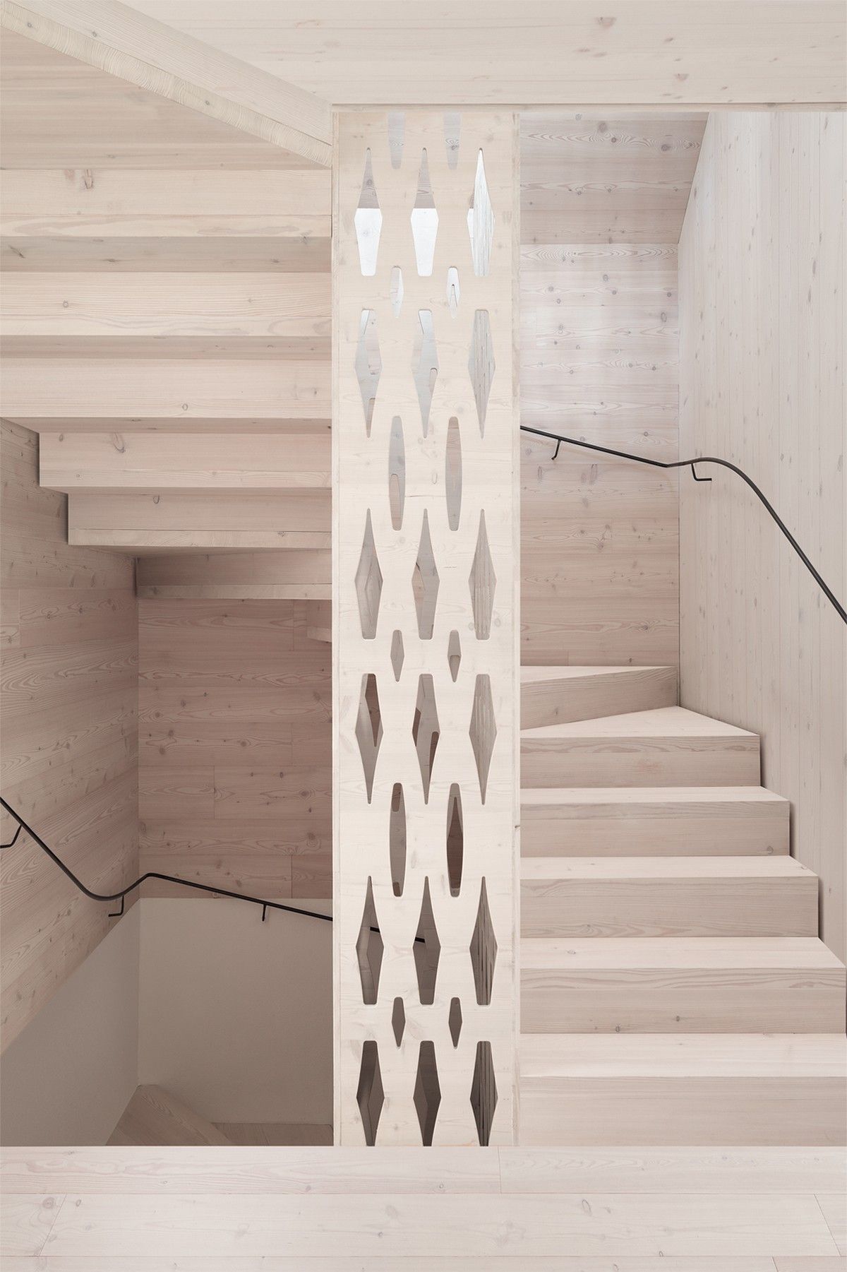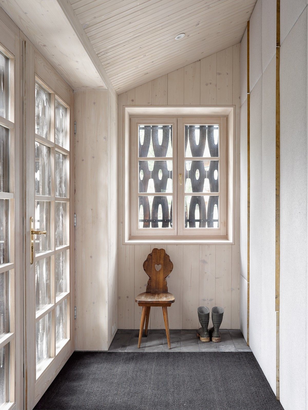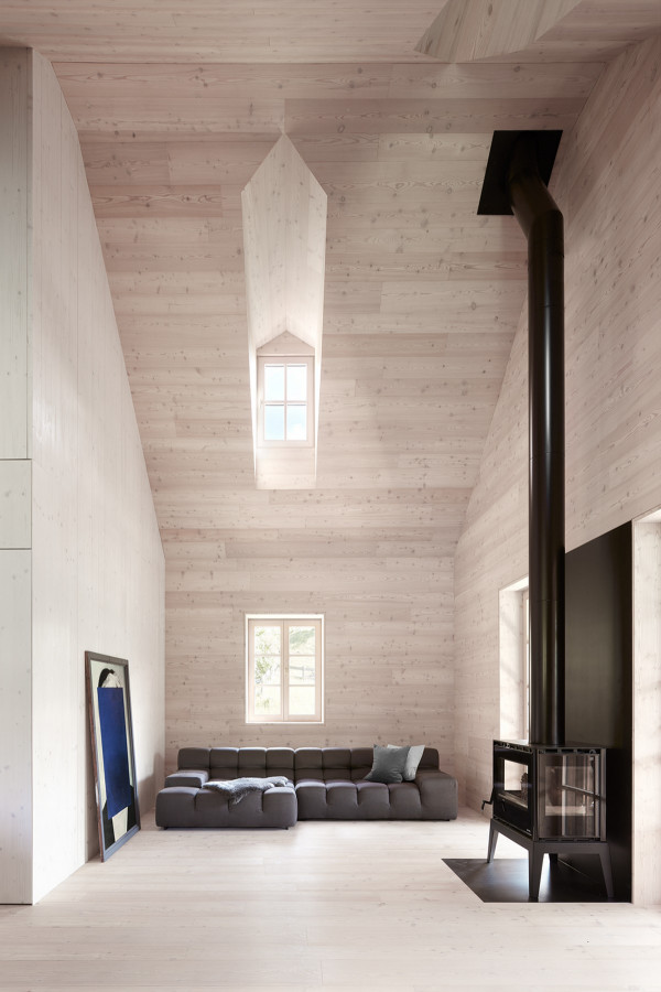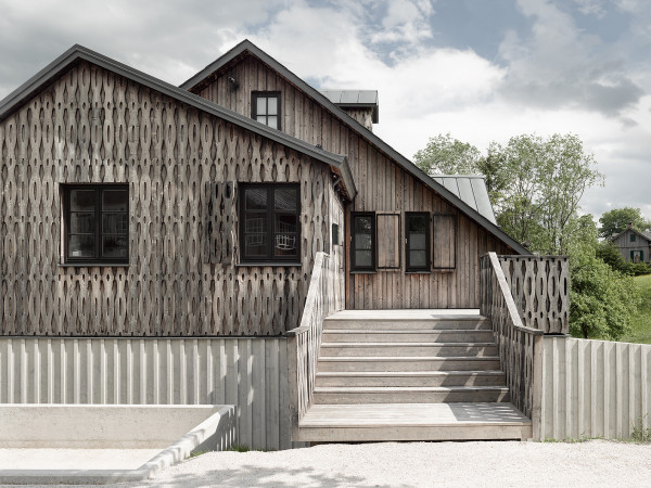 Снаружи дом в основном облицован обугленными и вымытыми вертикальными досками из лиственницы, применёнными в традиционном стиле, а пристройки здания полностью покрыты с использованием новой интерпретации местного исторического орнамента, вырезанного из досок. Интерьер разделён на цельную конструкцию нижнего этажа и конструкцию деревянного каркаса сверху. В отличие от довольно традиционных элементов экстерьера, ясные и минималистичные комнаты внутри создают современную и неповторимую обстановку. Внутренняя поверхность старого амбара была облицована белой промасленной лиственницей, тогда как новые пространства были созданы путем установки массивной деревянной конструкции, выделяющейся из старой композиции.