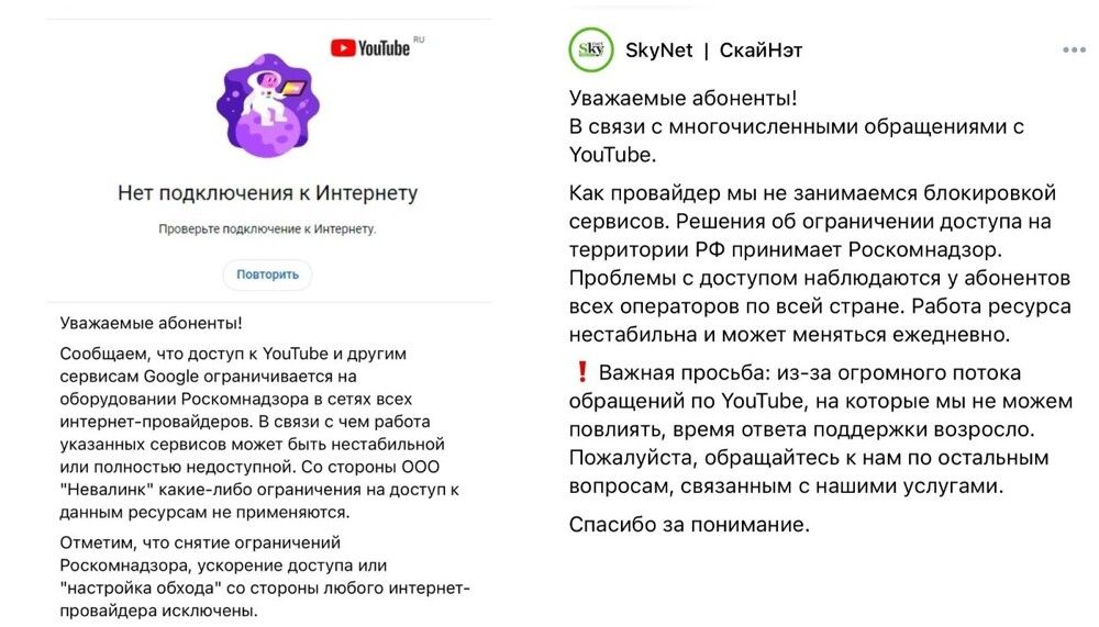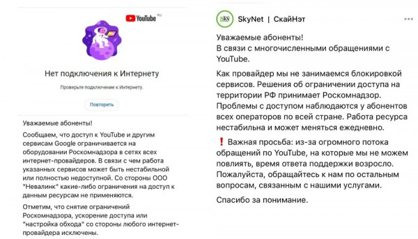 Свинцов не пояснил, что он подразумевает под полным ограничением YouTube. Но сообщается, что до настоящего дня Роскомнадзор лишь замедлял сервис. Вчера в Петербурге у нескольких местных провайдеров (SkyNet, "еТелеком" и "Невалинка") полностью перестал открываться видеохостинг. Ранее сайт работал, хоть и с заметным замедлением. В компаниях на жалобы пользователей ответили, что "причины лежат вне зоны влияния интернет-провайдера".