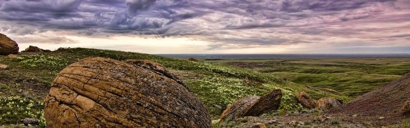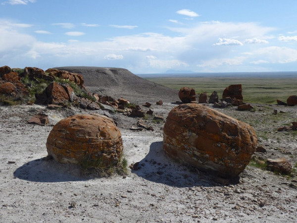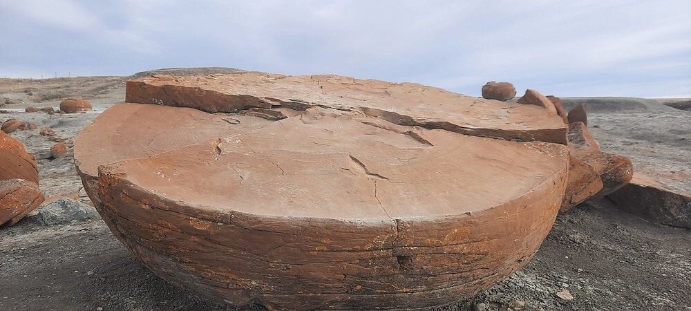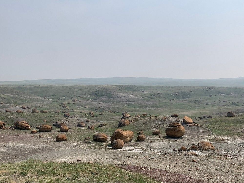 Среди первозданных холмов южной Альберты разбросаны огромные круглые красные камни правильной формы.