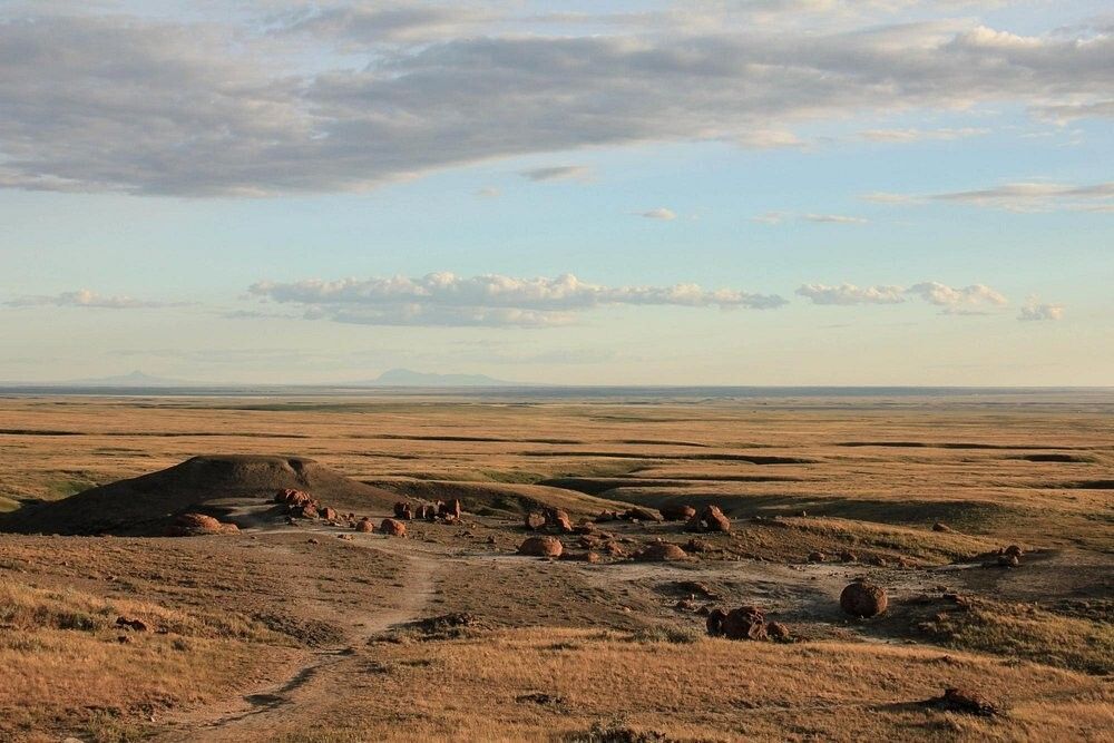 При виде гигантских сфер огненного оттенка, усеивающих степь, возникает ощущение, будто ты перенёсся на Марс. Некоторые валуны превышают в диаметре два с половиной метра, что делает их одними из крупнейших песчаниковых конкреций в мире.
