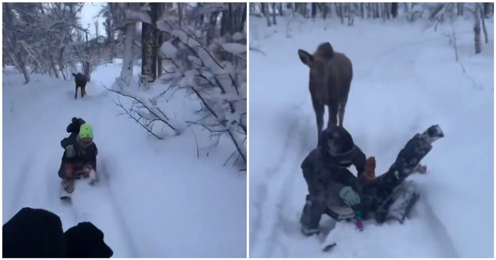 Лосиха ручная и с большим удовольствие носится за детворой по зимним тропам.