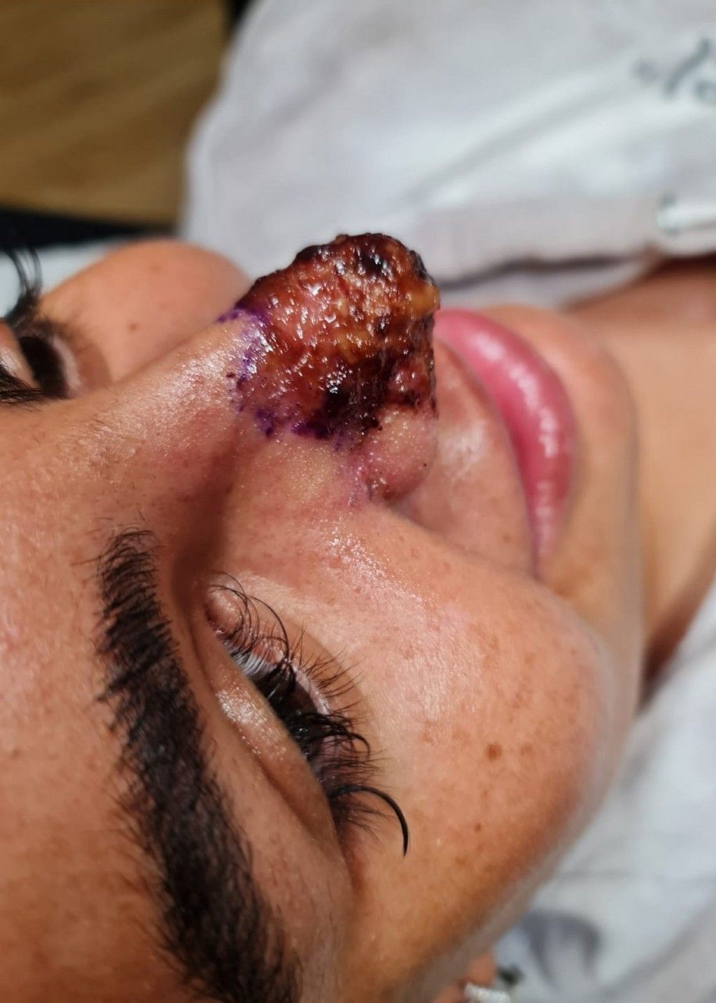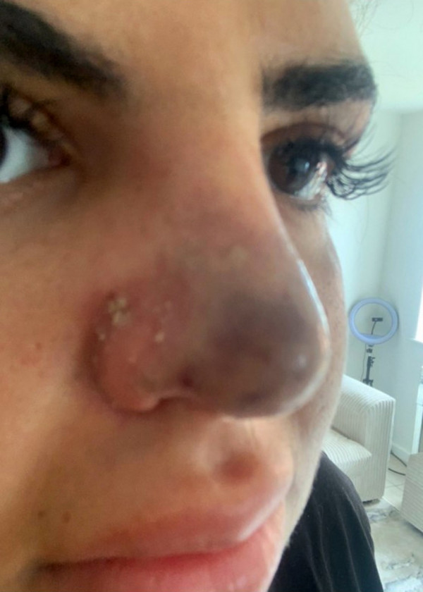 Через несколько дней на ее носу появились небольшие белые пузырьки, которые затем стали черными. В панике британка обратилась в больницу, где у нее диагностировали некроз - отмирание тканей. Оказалось, что при введении филлера ей повредили сосуд, который снабжал кровью кончик носа.Мортон провели специальное сканирование, которое показало, что в ее нос и верхнюю губу вообще не поступает кровь. Девушке назначили лечение, однако отметили, что у нее на лице все равно останутся шрамы из-за некроза. Кроме того, неизвестно, приобретут ли кончик носа и губа былой цвет.