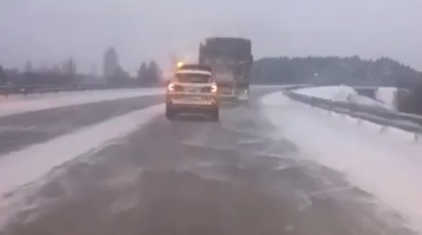 Машина фото/видеофиксации нарушений ПДД попала в объектив камеры водителя из-за нарушений правил дорожного движения. Снято на федеральной трассе Тюмень - Ханты-Мансийск.