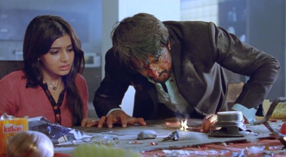 Сцена из индийского фильма "Муха" (Eega, 2012), в котором мужчина после смерти перерождается в муху и пытается отомстить убийце, а также спасти свою возлюбленную.