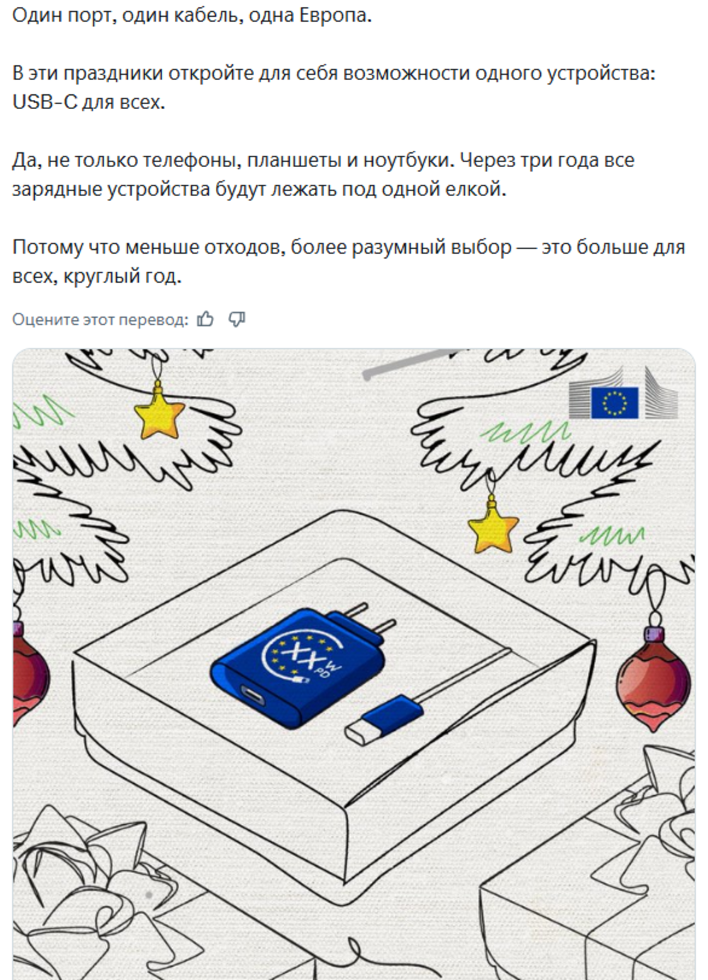 Еврокомиссия с помпой отчиталась о введение во всей Европе единого стандарта для зарядки портативных электронных устройств и попала в скандал. Казалось бы, что общего между разъёмом USB Type-C и Третьим Рейхом? Но тот, кто писал текст, видимо, был настолько экзальтирован, что вспомнил нацистские лозунги и использовал один из них в несколько изменённом, но легкоузнаваемом виде. "Один порт, один кабель, одна Европа. В эти праздники откройте для себя возможности одного устройства: USB-C для всех", - говорится в сообщении.