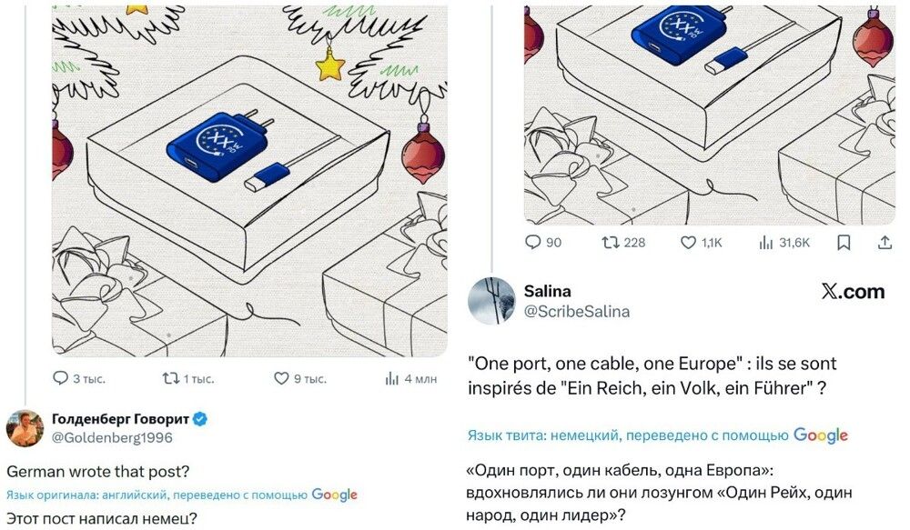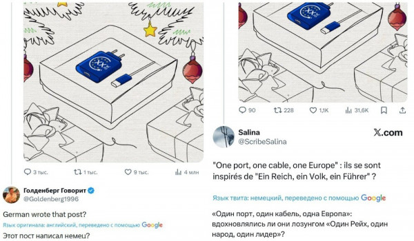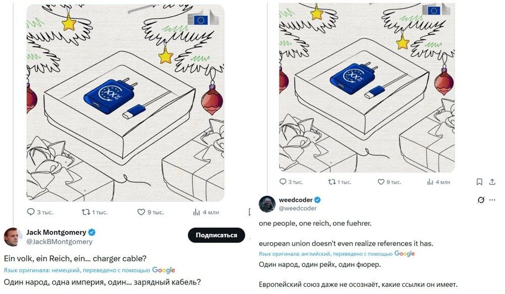 Пользователи сети тут же вспомнили, что формулировка о едином разъёме почти дословно повторяет лозунг нацистской Германии про один народ, один рейх и одного фюрера ("Ein Volk, ein Reich, ein Führer"). Кто-то начал обвинять Еврокомиссию в нацизме и тупости, а другие принялись издеваться над не самой успешной презентацией решения, к которому власти еврозоны шли с 2021 года.