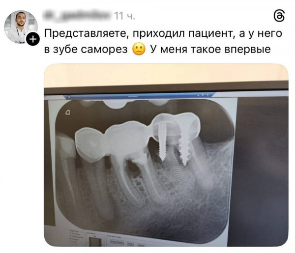 Стоматолог поделился снимком зубов пациентаУмные мысли преследовали мужчину, но желание сэкономить было сильнее. Интересно, шуруповёртом ему вкручивали или отвёрткой?