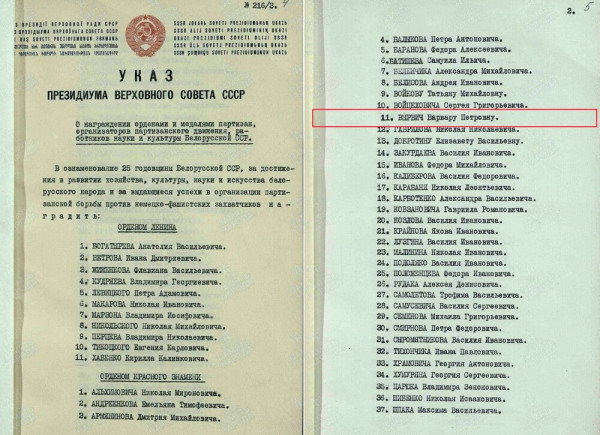 Награды сами говорили за них. Варвара Петровна была награждена орденом Красного Знамени, орденом Отечественной войны 2 степени, медалями "За боевые заслуги" и "Партизану Отечественной войны".ПАМЯТЬ