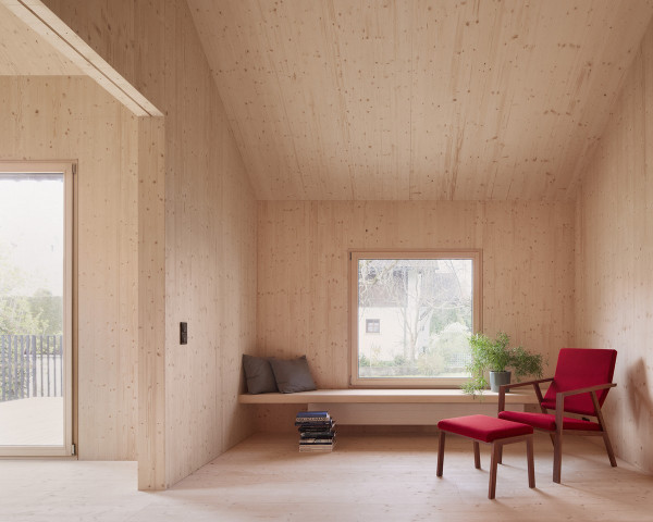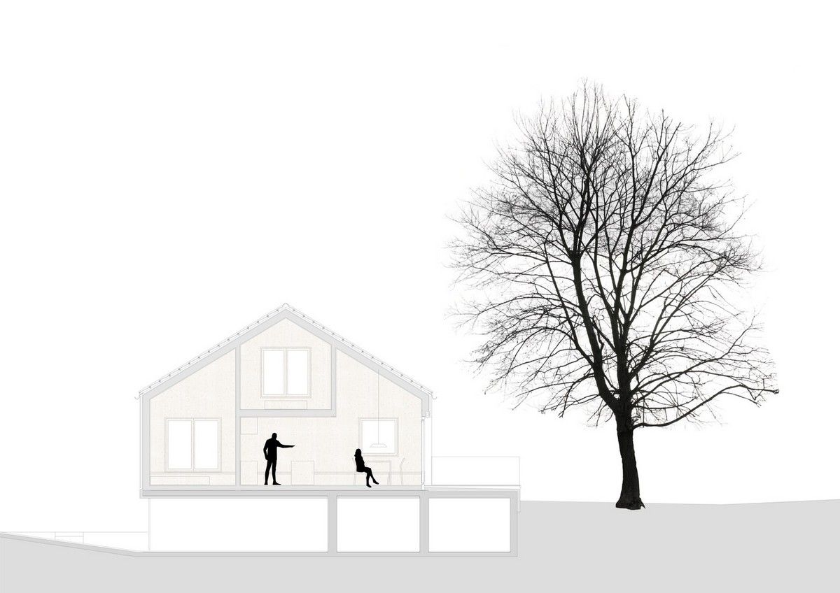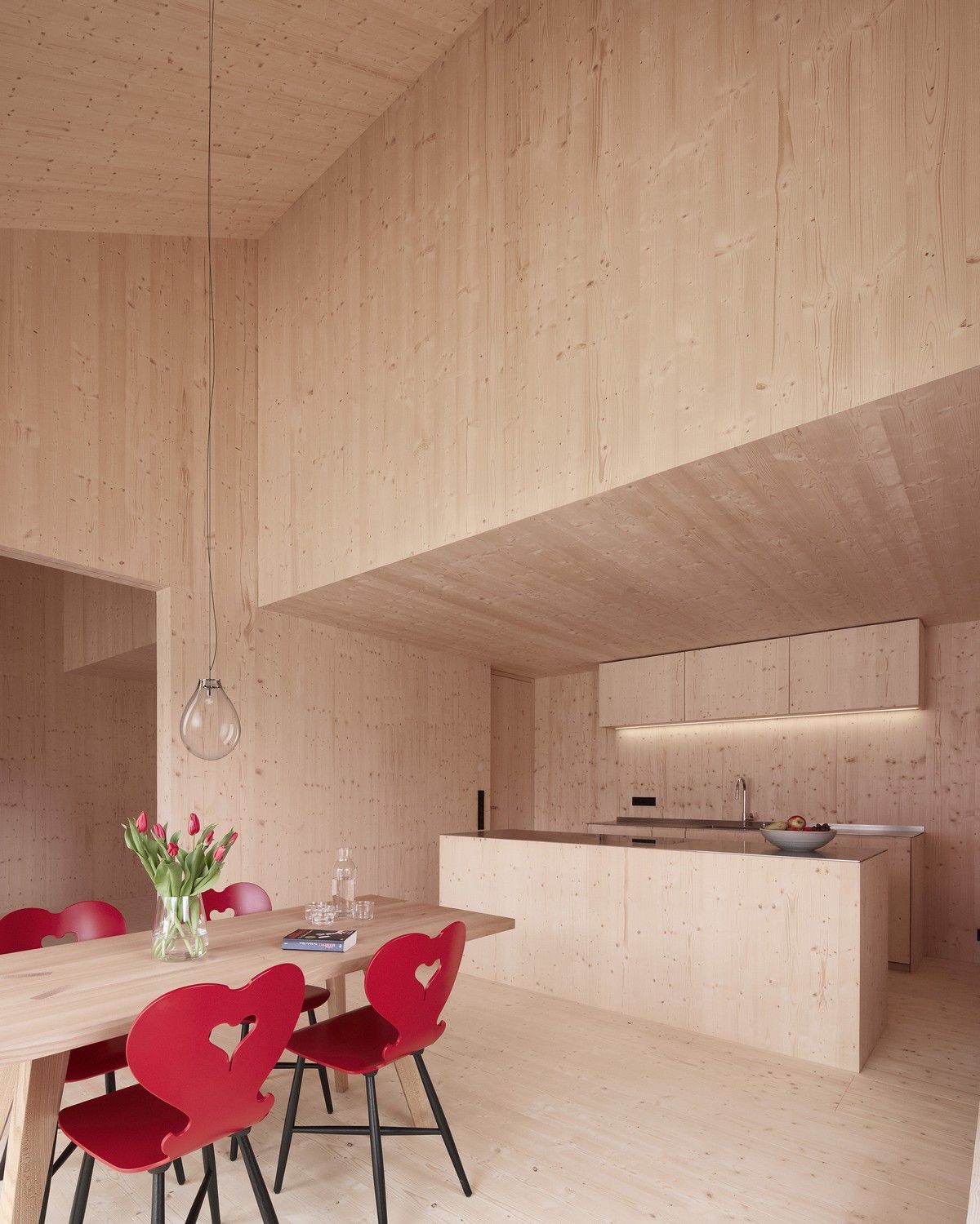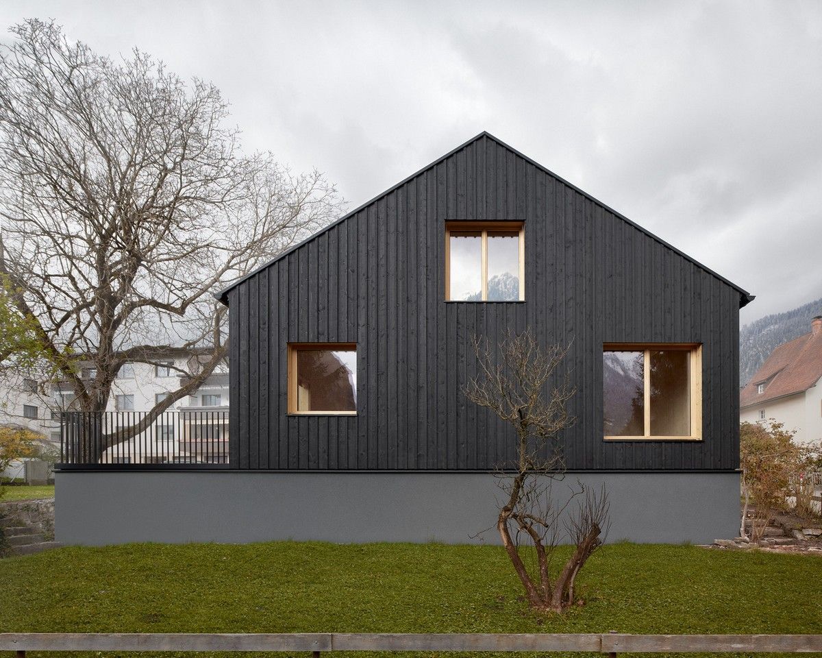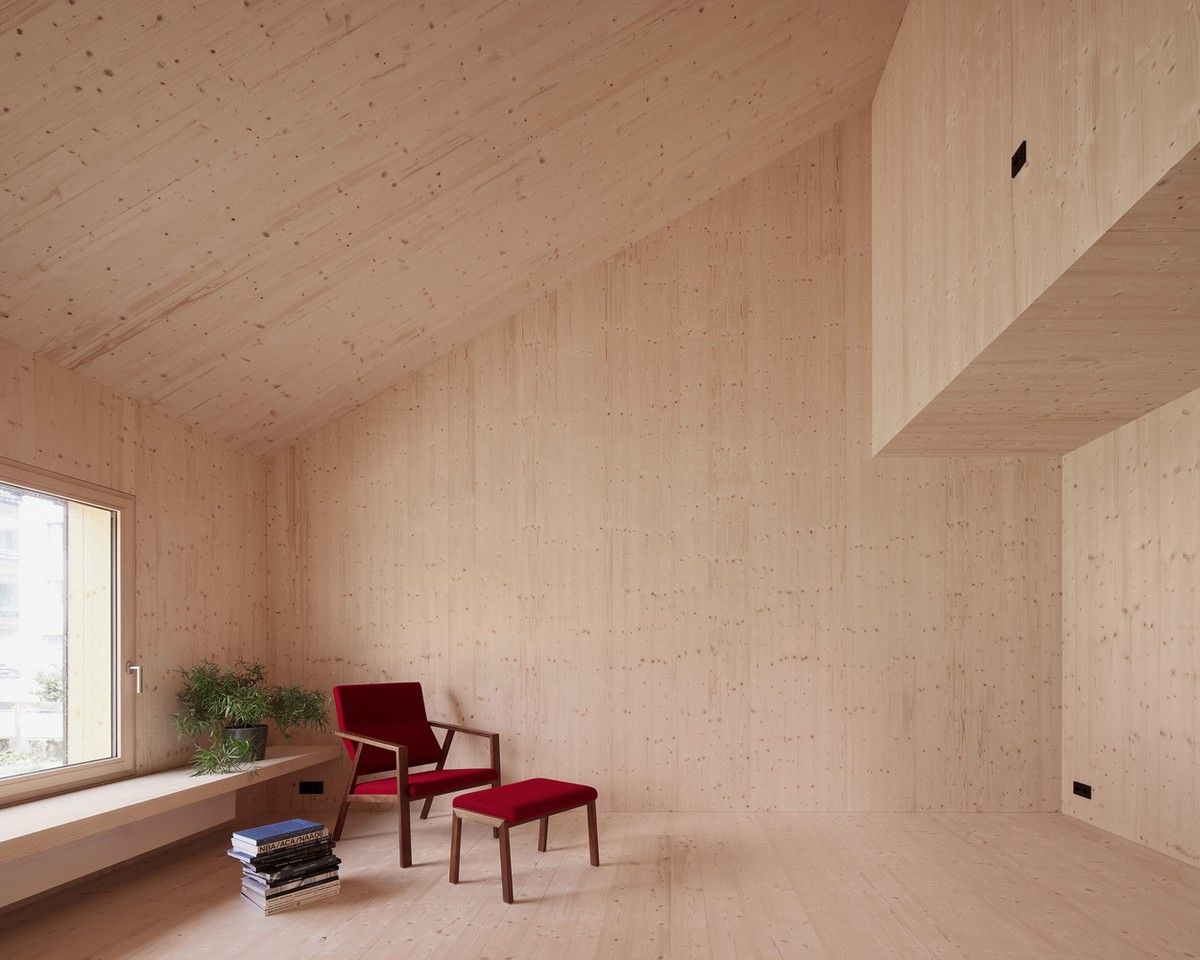 Проект "Дом из ели" (House Made of Spruce), разработанный архитектурным бюро MWArchitekten, реализован в 2021 году в городе-курорте Блуденц, Форарльберг, Австрия. Проект представляет собой реконструкцию старого двухэтажного дома, первый этаж которого был построен перед Второй мировой войной. В планах домовладельца было строительство большого долговечного дома, поэтому основание здания было заложено очень прочное. Строительство было прервано войной, и второй этаж был завершен уже после ее окончания. В отличие от мощного и надежного нижнего уровня, верхний этаж оказался более простым и не таким крепким. Его деревянная конструкция со временем стала ветхой и потребовала замены. В связи с этим, архитекторы приняли решение построить новый дом, используя основание старого здания, которое, спустя много лет, не утратило своей прочности, а также сохранить и отремонтировать большой подвал.