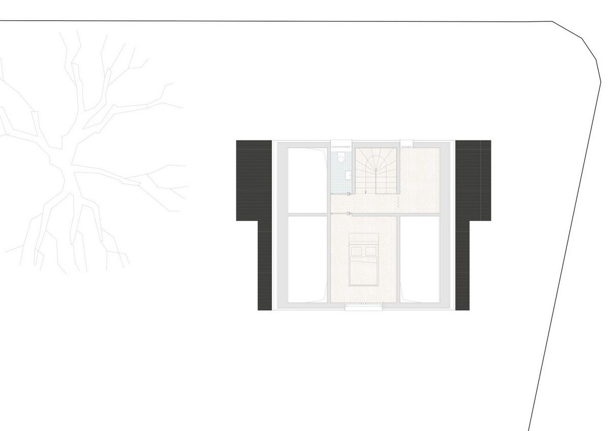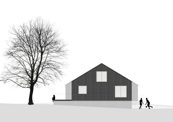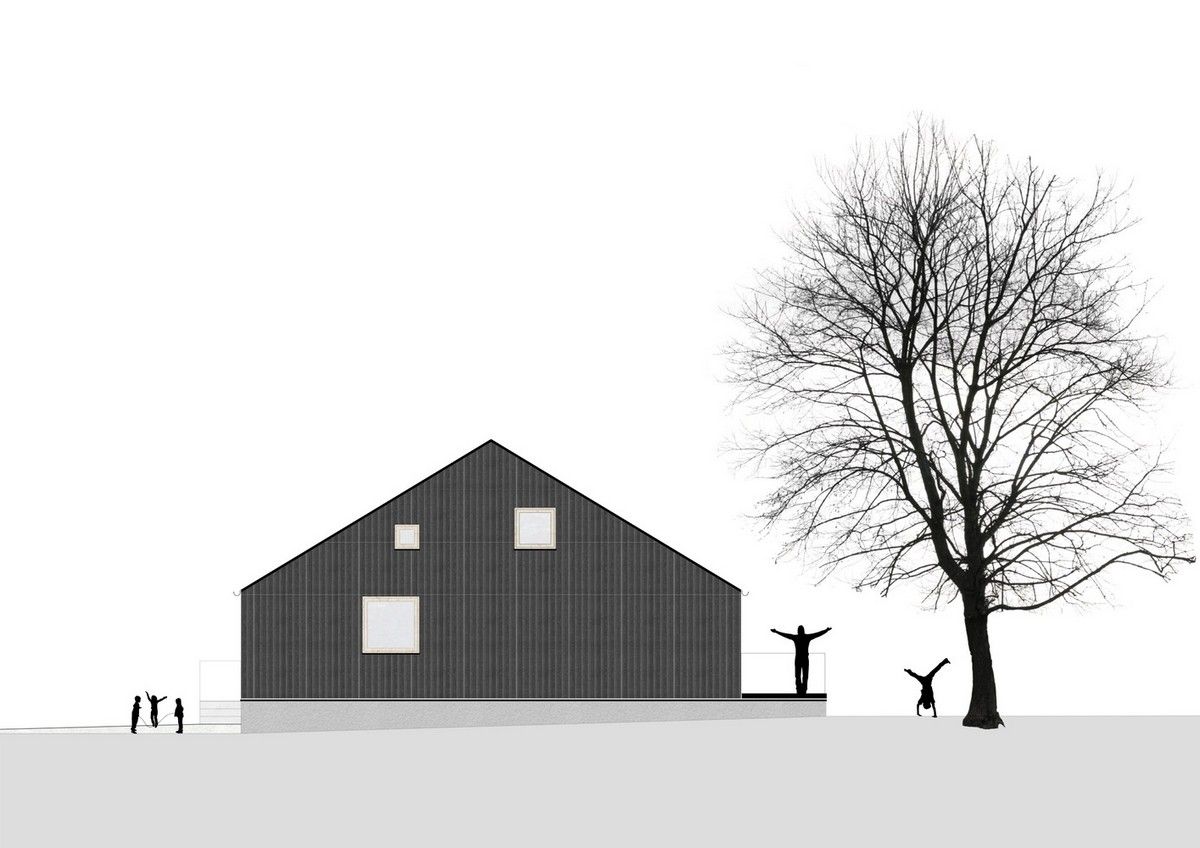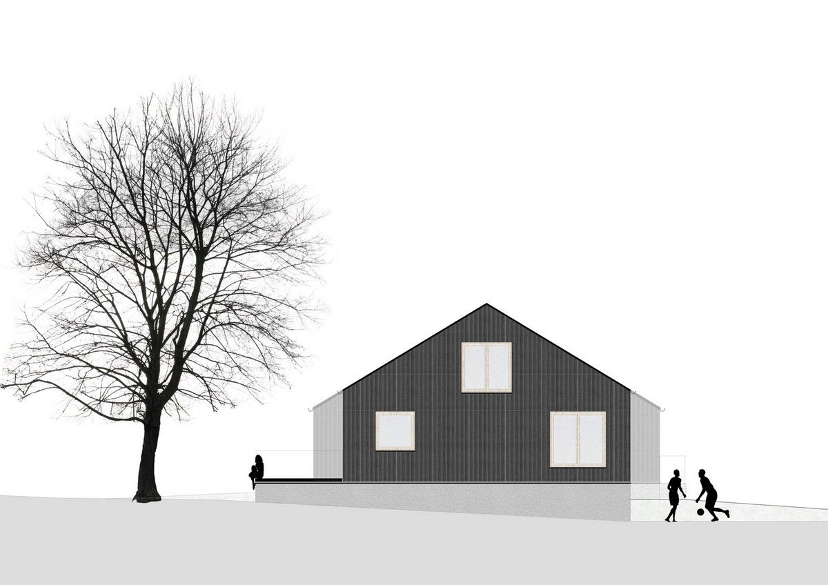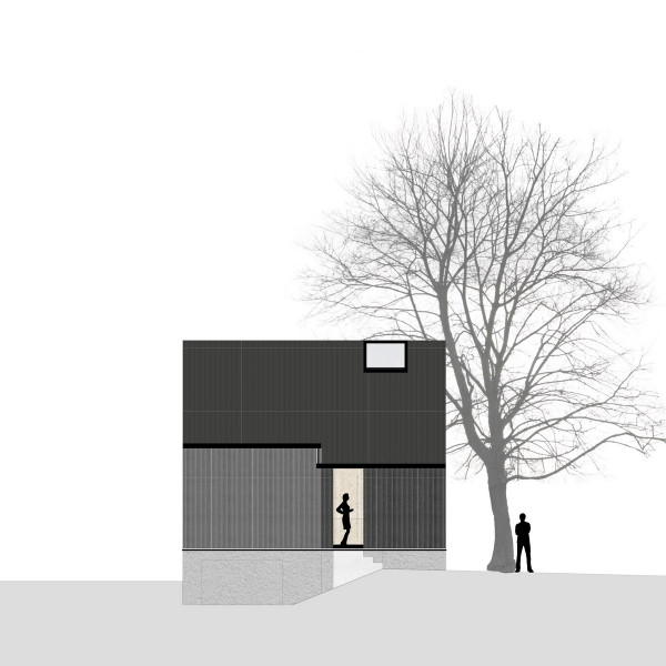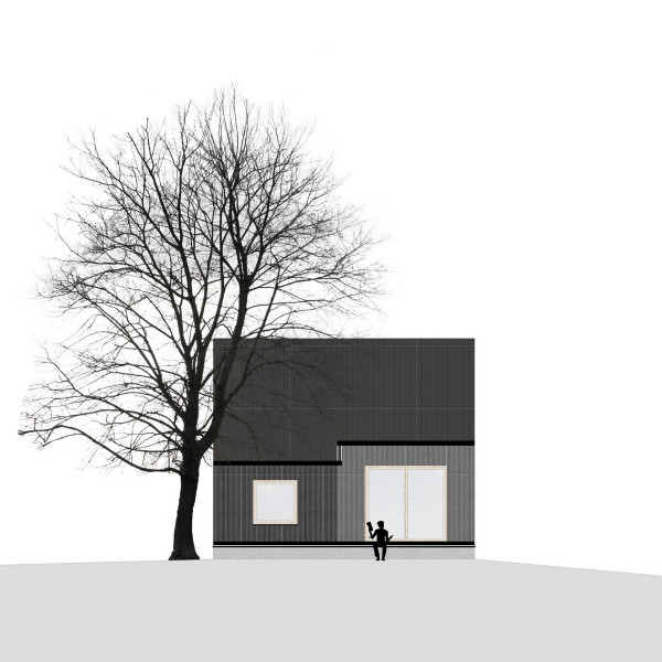 Новое здание сохраняет первоначальный внешний объем, соответствующий требованиям архитектурного планирования города, и его внутреннюю структуру с функциональной нагрузкой. Дом имеет простую геометрическую форму с двускатной крышей. Все деревянные материалы в проекте выполнены из необработанной древесины ели. Конструкция стен состоит из вентилируемого фасада, облицованного древесиной ели, за которым находится деревянный каркас, наполненный целлюлозой. Далее, за ним следует обшивка из панелей, которые также выполнены из древесины ели. Черный фасад эффектно контрастирует с утопленными светлыми окнами, открывающими вид в уютный интерьер. Пол представляет собой слой бруса с изоляционным наполнителем, обшитый еловыми досками.Общая площадь дома составляет 110 квадратных метров. Первый этаж дома занимает социальная зона - гостиная и столовая, имеющие двойную высоту, кухня, а также главная спальня с ванной комнатой. На втором этаже размещается еще одна спальня. Стены, пол и потолок, облицованные приятным светлым деревом, создают привлекательный интерьер, похожий на альпийскую хижину. Однородный дизайн поверхностей и тщательно подобранные материалы, среди которых доминирующим является натуральная древесина, создают оригинальный скульптурный интерьер, наполненный домашним теплом и уютом.