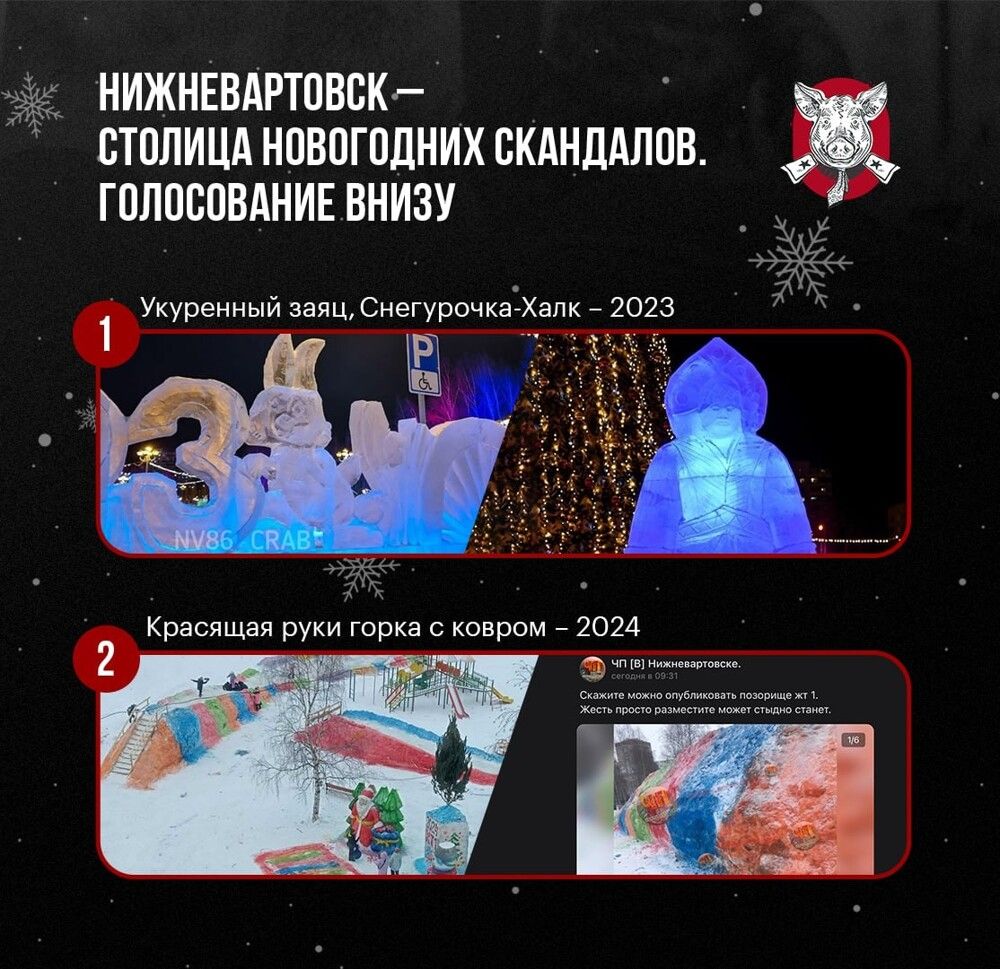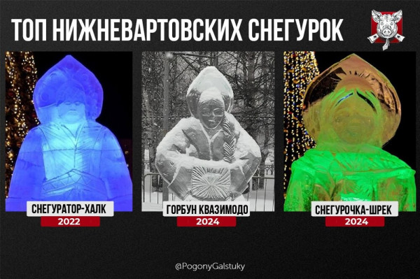 Но вообще, Нижневартовск - благодатное поле для критики местных властей по поводу украшения города к Новому году. И складывается ощущение, что администрация делает это намерено. СМИ напоминают, что власти ежегодно "радуют" жителей города упоротыми интересными арт-объектами. В этом году, помимо снегирей, на главной площади установили Деда Мороза и Снегурочку без лиц. В администрации ответили журналистам, что работы над фигурами ещё не закончены. Позднее лица действительно появились, но стало ли от этого лучше - вопрос.