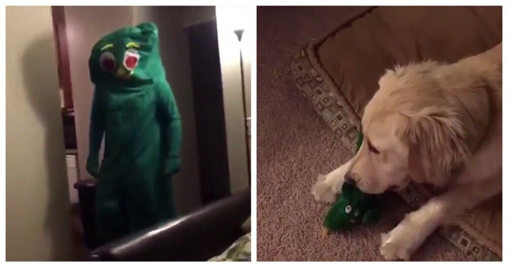 Хозяин порадовал своего пса необычным образом. Он надел костюм в виде любимой игрушки питомца.