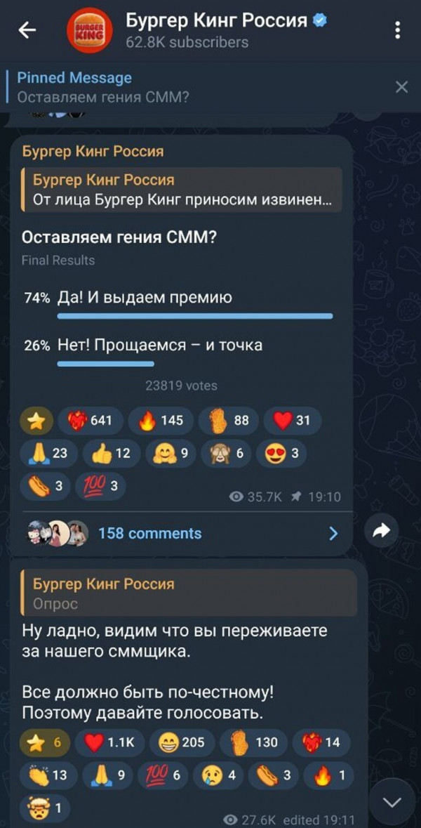 В комментах надор возмутился, почему это сммщика-героя уволили за попытку мира. Канал запустил опрос с вопросом, оставлять ли гения SMM. Народ проголосовал решительно: 74 процента за возвращение, более двадцати трёх тысяч голосов.