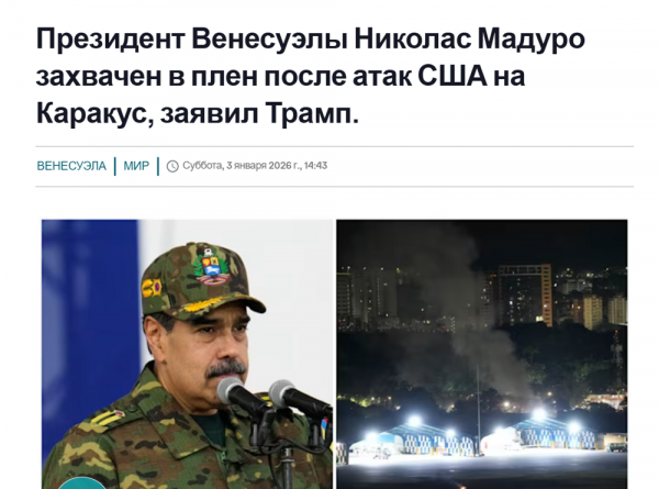 04:30 Дональд Трамп в своей привычной манере объявил о поимке "наркодиктатора" через социальные сети. Для стороннего наблюдателя этот триумфализм выглядит тревожно: если главу государства можно вывезти из его страны в кандалах за пару часов, то ни один лидер в мире больше не может чувствовать себя в безопасности, если его политика не совпадает с курсом Вашингтона.