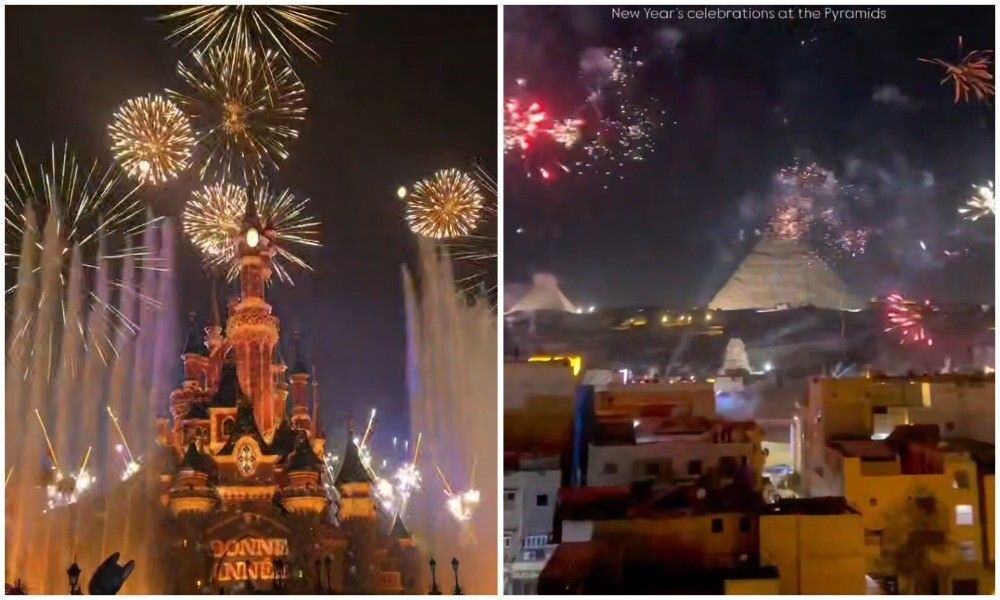 Новогодний салют над пирамидами Хеопса и над парижским Диснейлендом
