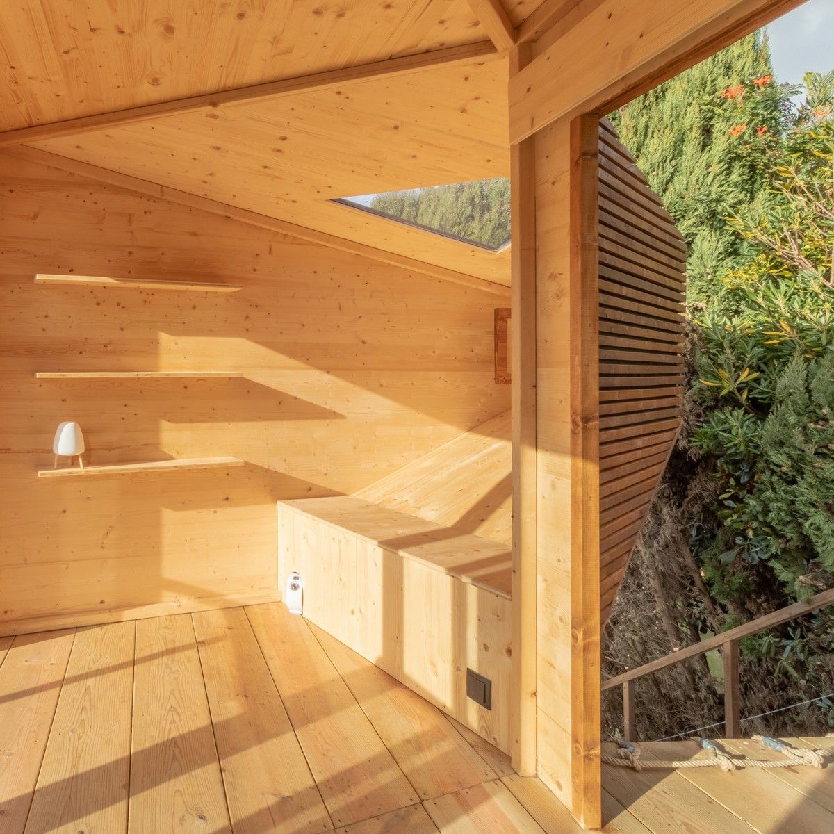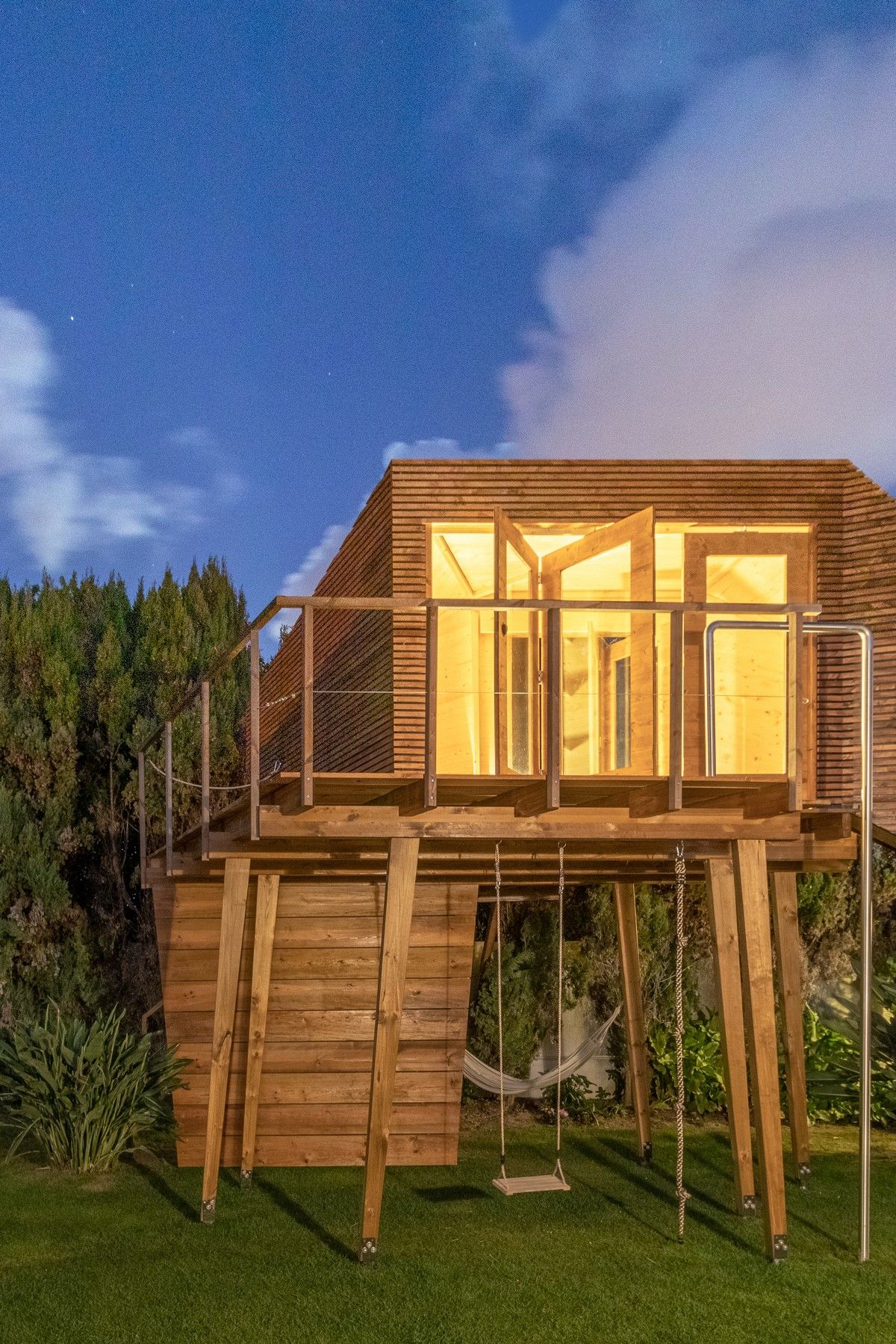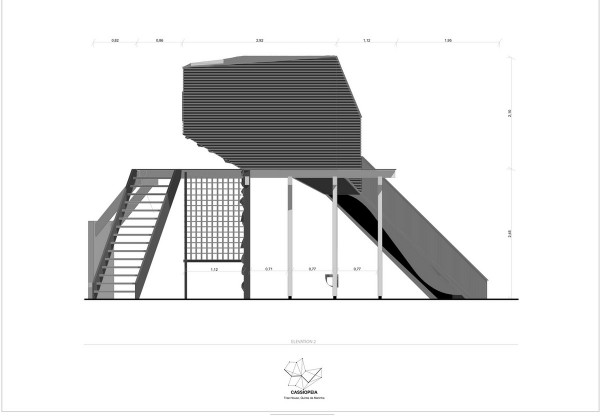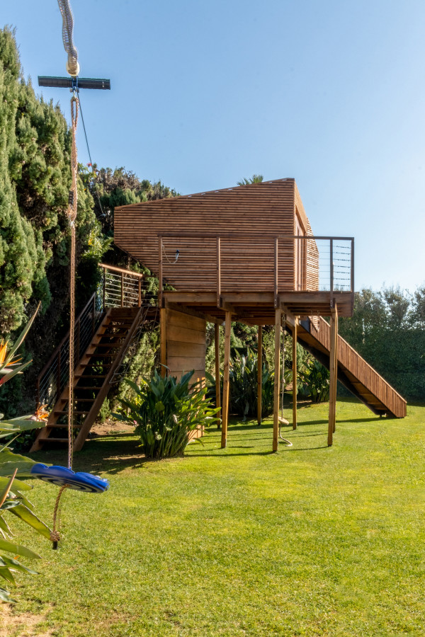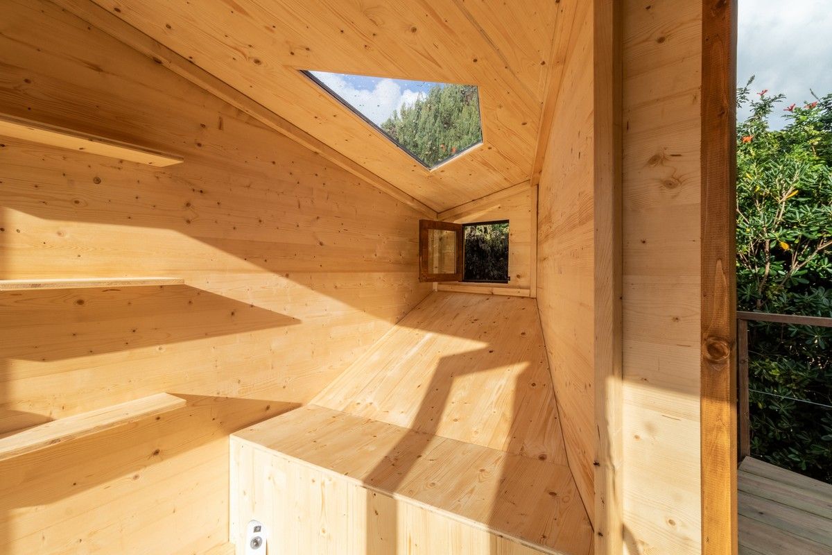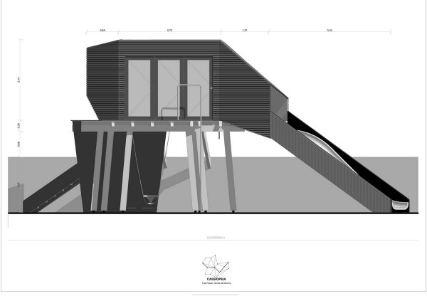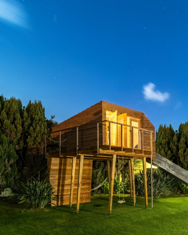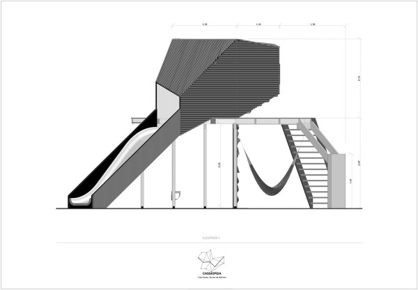 Дом под названием Кассиопея - это небольшое, площадью всего 20 квадратных метров строение, возвышающееся на высоких деревянных ножках-столбах. Строительство объекта осуществлялось с минимальным воздействием на природу, а его функционирование практически не влияет на окружающий ландшафт. Выполненный из натурального дерева, домик почти незаметен на фоне высоких деревьев.Прежде всего, Cassiopeia Treehouse - это многоуровневая и многофункциональная детская площадка, которая включает в себя множество игровых маршрутов для развлечений детей разного возраста, среди которых пожарный столб, горки, качели, зиплайны, сетчатые кровати, скульптурная стенка для скалолазания, брусья, турники.Но это не только детская площадка, но и убежище для взрослых, желающих отключиться от повседневной суеты и просто отдохнуть или помечтать в тишине. Деревянная хижина - это также привилегированная площадка для наблюдения за звездами через объектив телескопа.Основу дома составляют скрытые в земле металлические винты, поддерживающие высокие колонны и балки строения, на вершине которых установлен каркас из панелей CLT, окрашенных в черный цвет. Фасады домика обшиты деревянными рейками, которые плотно соединены с панелями CLT. Стены и потолок внутри строения облицованы светлой древесиной, придающей пространству ощущение чистоты и свежести. Стеклянные двери - гармошка легко объединяют экстерьер с интерьером, создавая единое пространство для игры или медитации.