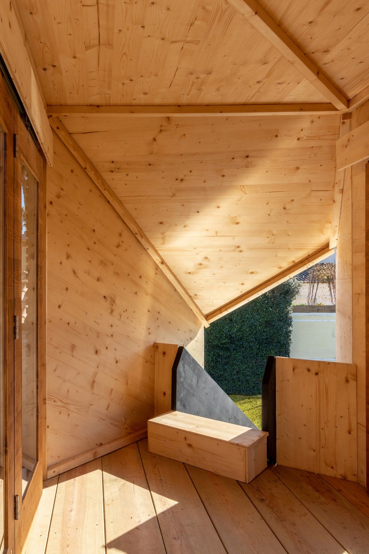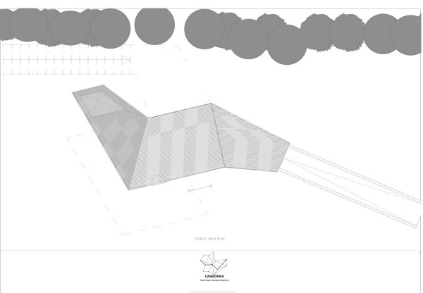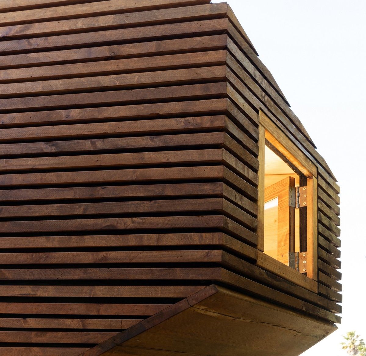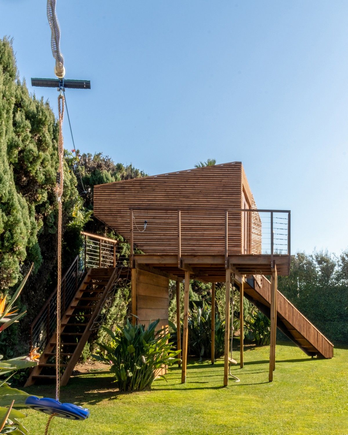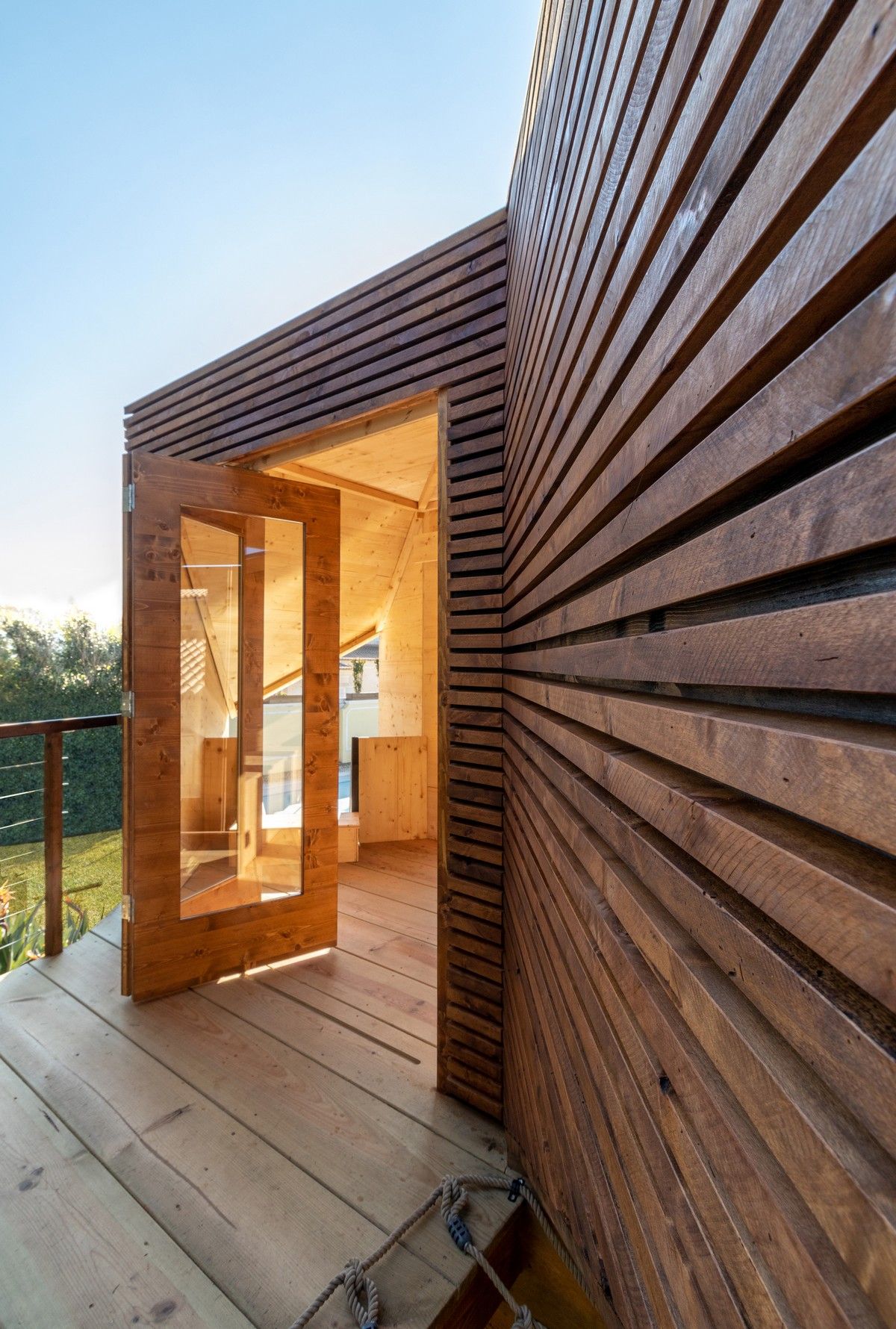 Дом под названием Кассиопея - это небольшое, площадью всего 20 квадратных метров строение, возвышающееся на высоких деревянных ножках-столбах. Строительство объекта осуществлялось с минимальным воздействием на природу, а его функционирование практически не влияет на окружающий ландшафт. Выполненный из натурального дерева, домик почти незаметен на фоне высоких деревьев.Прежде всего, Cassiopeia Treehouse - это многоуровневая и многофункциональная детская площадка, которая включает в себя множество игровых маршрутов для развлечений детей разного возраста, среди которых пожарный столб, горки, качели, зиплайны, сетчатые кровати, скульптурная стенка для скалолазания, брусья, турники.Но это не только детская площадка, но и убежище для взрослых, желающих отключиться от повседневной суеты и просто отдохнуть или помечтать в тишине. Деревянная хижина - это также привилегированная площадка для наблюдения за звездами через объектив телескопа.Основу дома составляют скрытые в земле металлические винты, поддерживающие высокие колонны и балки строения, на вершине которых установлен каркас из панелей CLT, окрашенных в черный цвет. Фасады домика обшиты деревянными рейками, которые плотно соединены с панелями CLT. Стены и потолок внутри строения облицованы светлой древесиной, придающей пространству ощущение чистоты и свежести. Стеклянные двери - гармошка легко объединяют экстерьер с интерьером, создавая единое пространство для игры или медитации.
