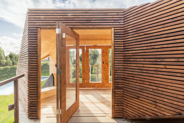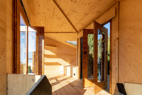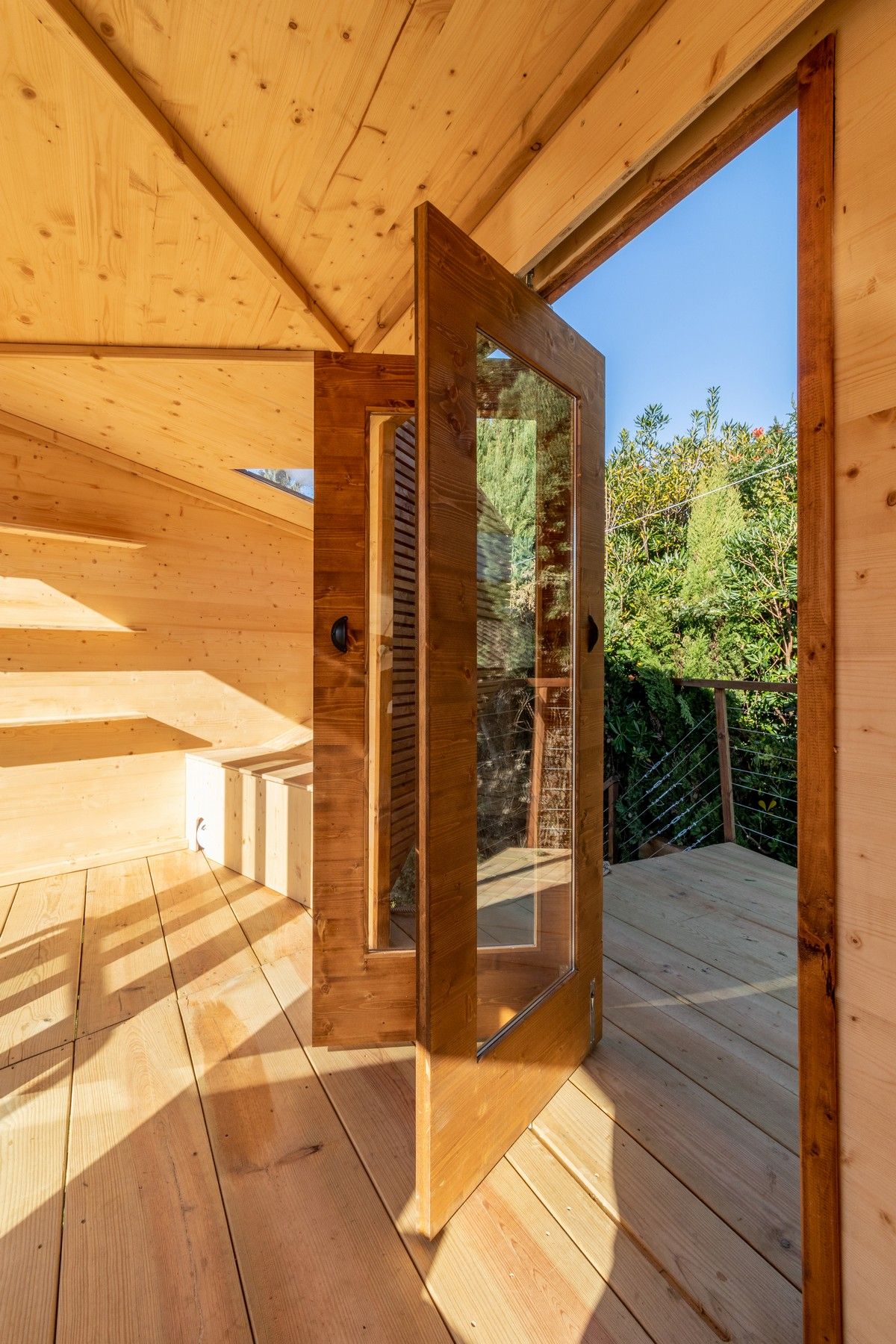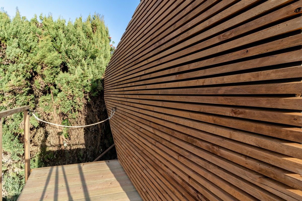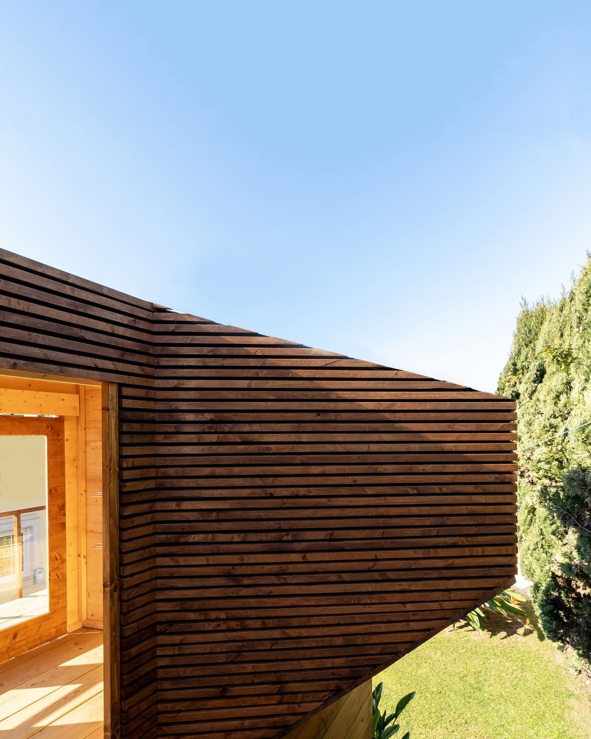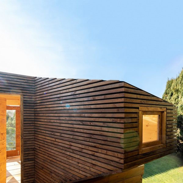 Дом под названием Кассиопея - это небольшое, площадью всего 20 квадратных метров строение, возвышающееся на высоких деревянных ножках-столбах. Строительство объекта осуществлялось с минимальным воздействием на природу, а его функционирование практически не влияет на окружающий ландшафт. Выполненный из натурального дерева, домик почти незаметен на фоне высоких деревьев.Прежде всего, Cassiopeia Treehouse - это многоуровневая и многофункциональная детская площадка, которая включает в себя множество игровых маршрутов для развлечений детей разного возраста, среди которых пожарный столб, горки, качели, зиплайны, сетчатые кровати, скульптурная стенка для скалолазания, брусья, турники.Но это не только детская площадка, но и убежище для взрослых, желающих отключиться от повседневной суеты и просто отдохнуть или помечтать в тишине. Деревянная хижина - это также привилегированная площадка для наблюдения за звездами через объектив телескопа.Основу дома составляют скрытые в земле металлические винты, поддерживающие высокие колонны и балки строения, на вершине которых установлен каркас из панелей CLT, окрашенных в черный цвет. Фасады домика обшиты деревянными рейками, которые плотно соединены с панелями CLT. Стены и потолок внутри строения облицованы светлой древесиной, придающей пространству ощущение чистоты и свежести. Стеклянные двери - гармошка легко объединяют экстерьер с интерьером, создавая единое пространство для игры или медитации.
