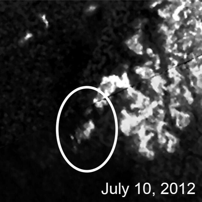 NASA связало аномалию с формированием и разрушением необычных айсбергов. Море Лигеи состоит из жидких углеводородов - преимущественно метана. Температура на поверхности Титана около -179 градусов Цельсия, что позволяет метану и этану существовать в жидком виде. Но при сезонном охлаждении или изменении давления эти органические соединения замерзают, формируя плавающие глыбы - аналоги земных айсбергов. Процесс может начинаться вокруг центров кристаллизации - твердых частиц, попавших в жидкость: пылинок из атмосферы или обломков породы с берега. Вокруг таких "зародышей" нарастает лед, образуя массивные структуры. Но стоит температуре повыситься, и это природное образование начинает разрушаться, что мы видим на третьем изображении (яркая вершина исчезла, а массивное основание "пришвартовалось" к берегу).
