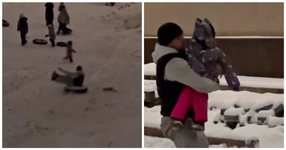 В Нальчике мужчина катался с горки на тюбинге, когда на ледяную дорожку неожиданно выбежала девочка. К счастью, у героя видео оказалась хорошая реакция.