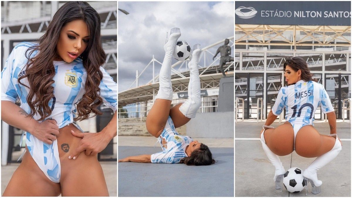 31-летняя бразильская фотомодель, двукратная обладательница титула "Мисс Бум Бум" Сьюзи Кортес (Suzy Cortez) на фотосессии в сексуальном боди в поддержку Месси в преддверии дебюта Аргентины в Кубке Америки 2021.