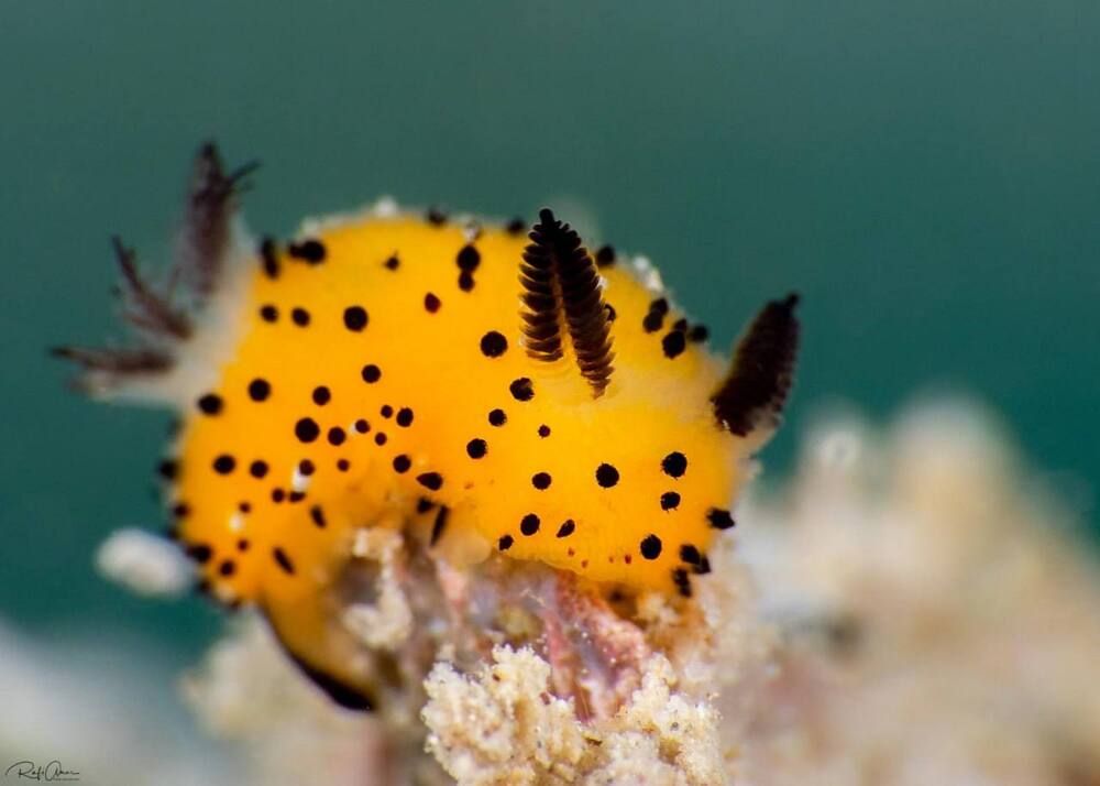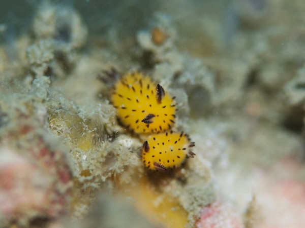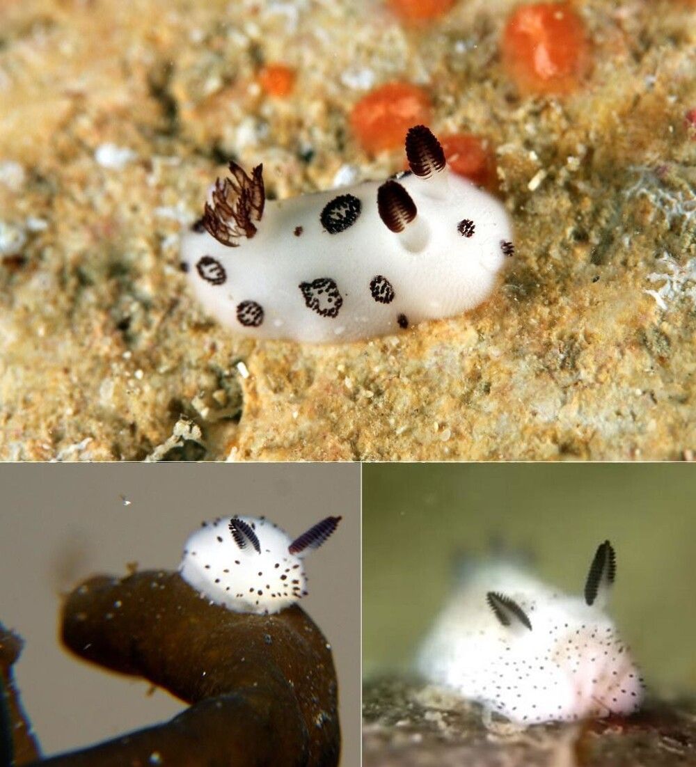 Перед вами морские кролики - Jorunna parva. Эти слизни покрыты крошечными "иголками", которые напоминают мех, а из их головы торчат ринофоры, похожие на ушки. Внешние жабры на задней части животного напоминают хвост.