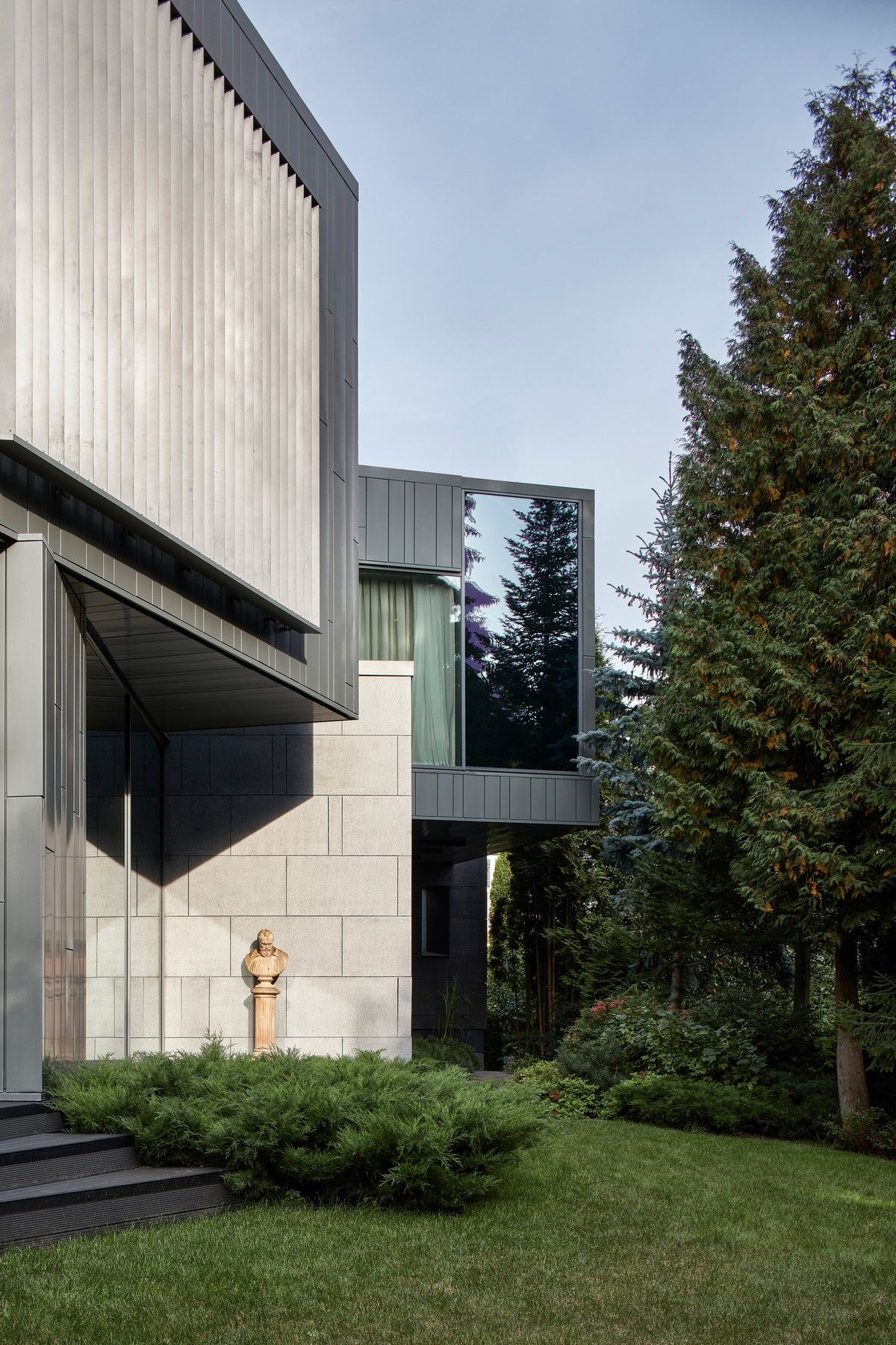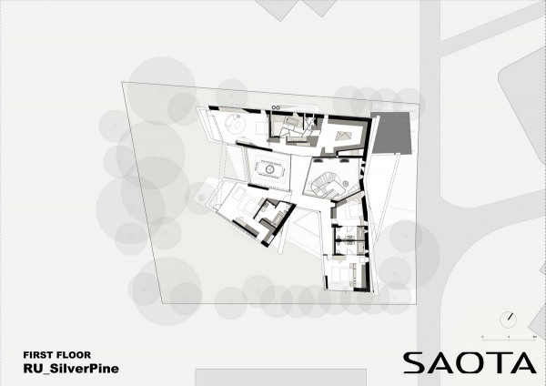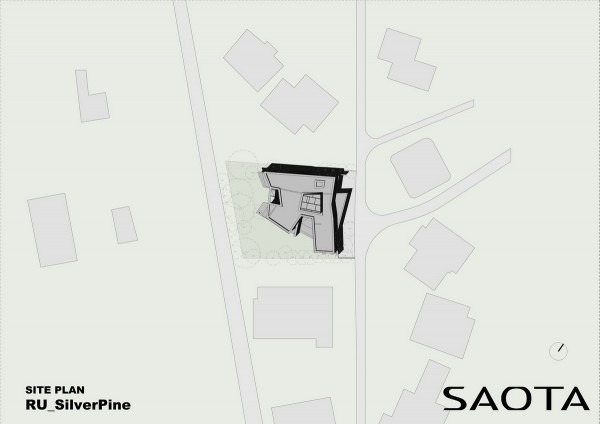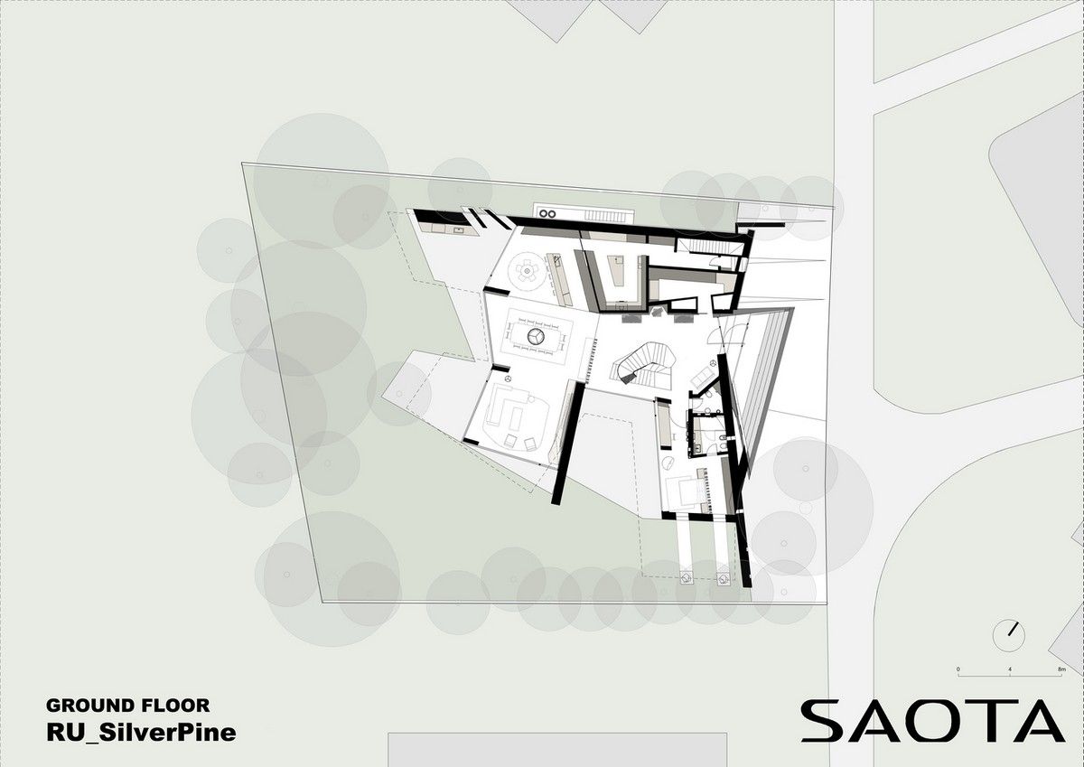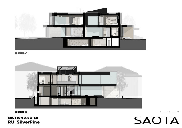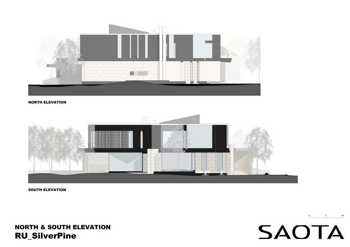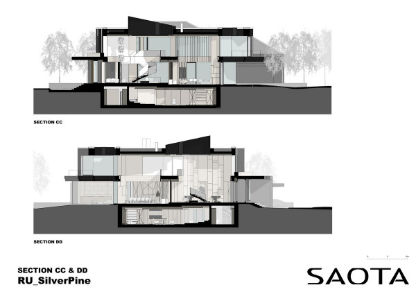 Архитектурная предпосылка представляет собой один из контрастов: мощное защитное присутствие фасада говорит о монолитном архитектурном характере столицы, построенном, чтобы противостоять крайностям жары и холода, которые могут варьироваться в зависимости от сезона на 70 градусов. Таким образом, общественный характер дома даёт современную интерпретацию архитектурного облика города. Главный вход окружен скульптурной композицией. Этот бронзовый фасад с подсветкой не только действует как визуальный сигнал к входному проёу на относительно невыразительном фасаде, но также передаёт обещание роскоши и света интерьеров в частных помещениях за порогом. Это усиливает впечатления от перехода из публичной сферы в частную с преобладающим лесным ландшафтом.Со стороны сада архитектура представляет собой контрастный фасад. Открытые стеклянные стены формируют вид на сосны изнутри, стирая разницу между "внутри" или "снаружи". Открытые террасы и гранёный угловой фасад создают дворы и внешние помещения, которые способствуют взаимодействию ландшафта и архитектуры, что является отходом от местных традиций. В летние месяцы можно жить на улице, как в Южной Африке или Калифорнии. Зимой интерьеры, которые, тем не менее, тёплые и уютные, могут воспевать красоту снежного пейзажа и сосен в совершенно новом подходе к суровым условиям. Даже зимой в центре внимания остается терраса, а не камин. SAOTA использовала серебристо-серо-металлическую облицовку экстерьера, которая дополняет и подчёркивает зелень растений и деревьев в окружающем лесу, обеспечивая захватывающий пейзаж. Фасад сам по себе выполнен из натурального материала, подчеркивая качество изготовления на заказ в деталях, что говорит об уникальном индивидуальном подходе к дизайну и меблировке дома, особенно в дизайне интерьера.Тяжёлые, защитные свойства фасада, особенно уличного, уступают место тёплому, живому интерьеру, как внешняя оболочка жеоды может открывать теплый агат или мерцающий хрустальный интерьер. Он придаёт изысканное, ювелирное качество интерьеру, который отличается от внешнего вида и кажется несколько причудливым и игривым. Внутри преобладают натуральные материалы, от экзотического мрамора с подсветкой до металлических и деревянных поверхностей, которые придают мягкость и тепло. Закрученная скульптурная лестница игриво контрастирует с угловатыми архитектурными элементами, где они сходятся, решая их в органическом цвете и сигнализируя о тонком изменении характера между более общедоступным жилым пространством на первом уровне и спальнями наверху.