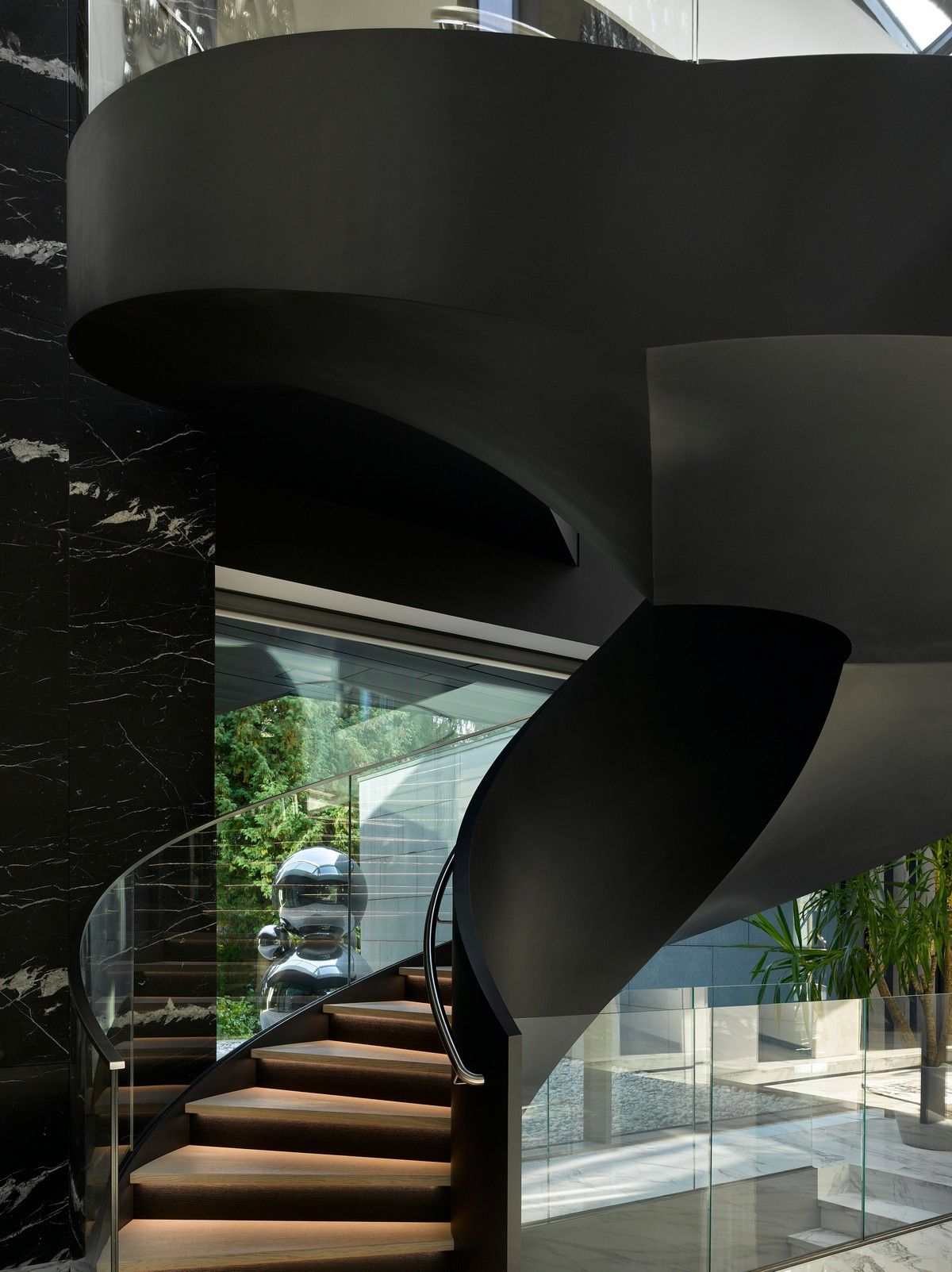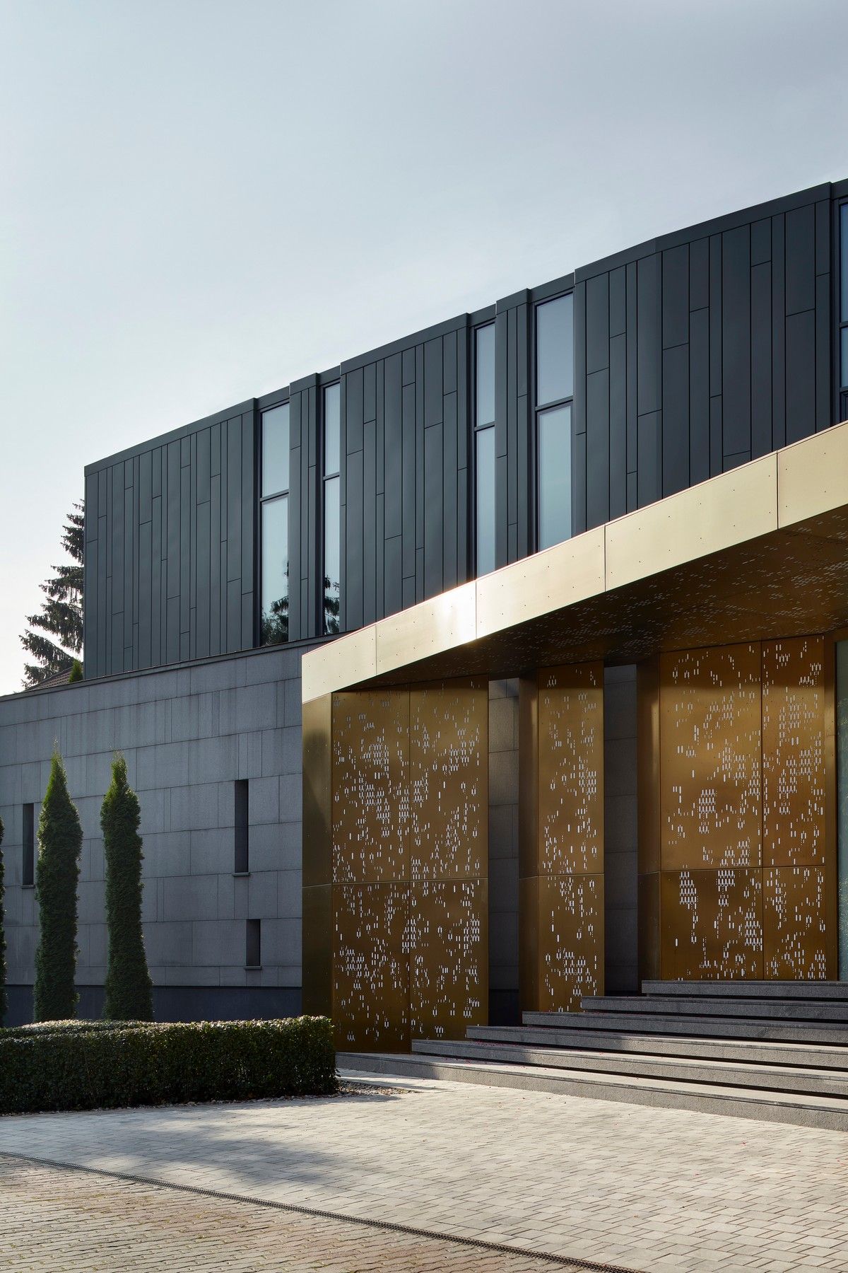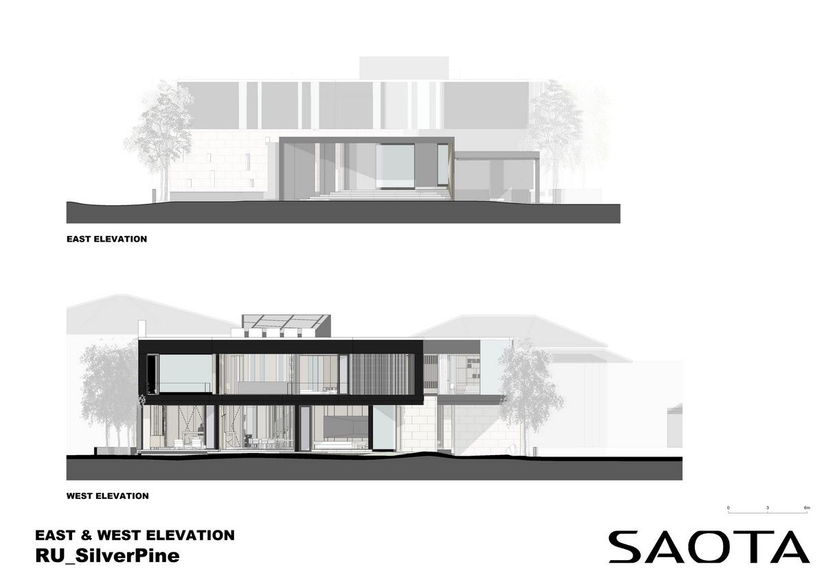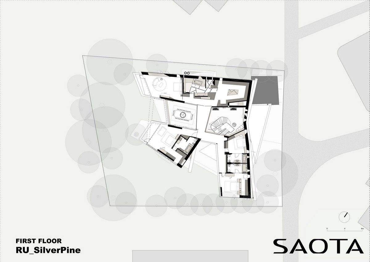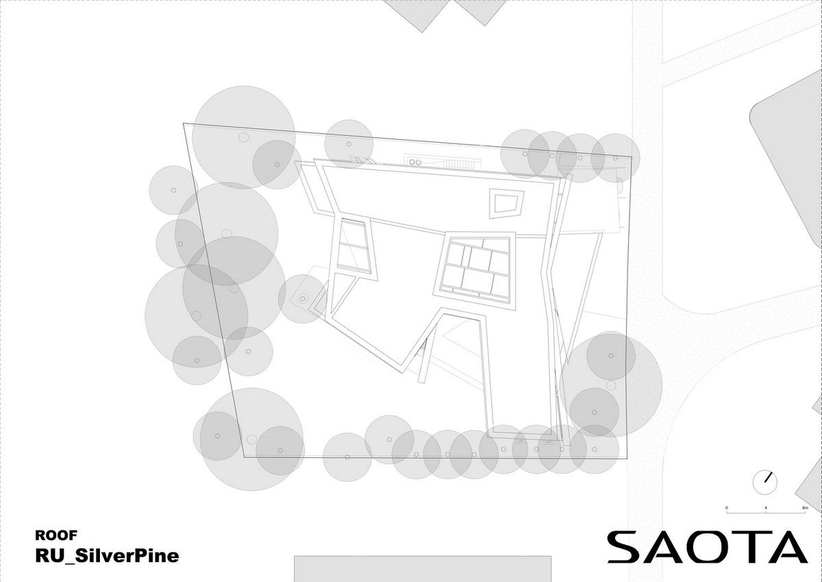 Архитектурная предпосылка представляет собой один из контрастов: мощное защитное присутствие фасада говорит о монолитном архитектурном характере столицы, построенном, чтобы противостоять крайностям жары и холода, которые могут варьироваться в зависимости от сезона на 70 градусов. Таким образом, общественный характер дома даёт современную интерпретацию архитектурного облика города. Главный вход окружен скульптурной композицией. Этот бронзовый фасад с подсветкой не только действует как визуальный сигнал к входному проёу на относительно невыразительном фасаде, но также передаёт обещание роскоши и света интерьеров в частных помещениях за порогом. Это усиливает впечатления от перехода из публичной сферы в частную с преобладающим лесным ландшафтом.Со стороны сада архитектура представляет собой контрастный фасад. Открытые стеклянные стены формируют вид на сосны изнутри, стирая разницу между "внутри" или "снаружи". Открытые террасы и гранёный угловой фасад создают дворы и внешние помещения, которые способствуют взаимодействию ландшафта и архитектуры, что является отходом от местных традиций. В летние месяцы можно жить на улице, как в Южной Африке или Калифорнии. Зимой интерьеры, которые, тем не менее, тёплые и уютные, могут воспевать красоту снежного пейзажа и сосен в совершенно новом подходе к суровым условиям. Даже зимой в центре внимания остается терраса, а не камин. SAOTA использовала серебристо-серо-металлическую облицовку экстерьера, которая дополняет и подчёркивает зелень растений и деревьев в окружающем лесу, обеспечивая захватывающий пейзаж. Фасад сам по себе выполнен из натурального материала, подчеркивая качество изготовления на заказ в деталях, что говорит об уникальном индивидуальном подходе к дизайну и меблировке дома, особенно в дизайне интерьера.Тяжёлые, защитные свойства фасада, особенно уличного, уступают место тёплому, живому интерьеру, как внешняя оболочка жеоды может открывать теплый агат или мерцающий хрустальный интерьер. Он придаёт изысканное, ювелирное качество интерьеру, который отличается от внешнего вида и кажется несколько причудливым и игривым. Внутри преобладают натуральные материалы, от экзотического мрамора с подсветкой до металлических и деревянных поверхностей, которые придают мягкость и тепло. Закрученная скульптурная лестница игриво контрастирует с угловатыми архитектурными элементами, где они сходятся, решая их в органическом цвете и сигнализируя о тонком изменении характера между более общедоступным жилым пространством на первом уровне и спальнями наверху.