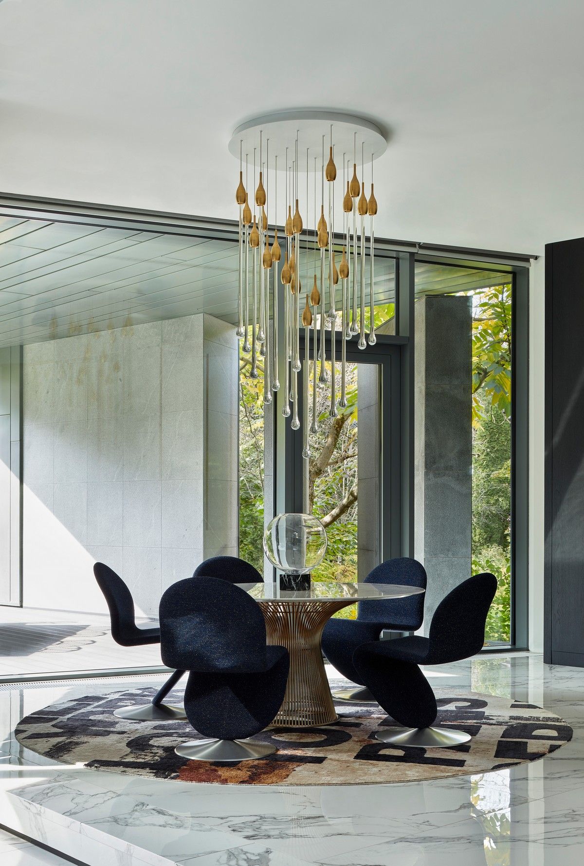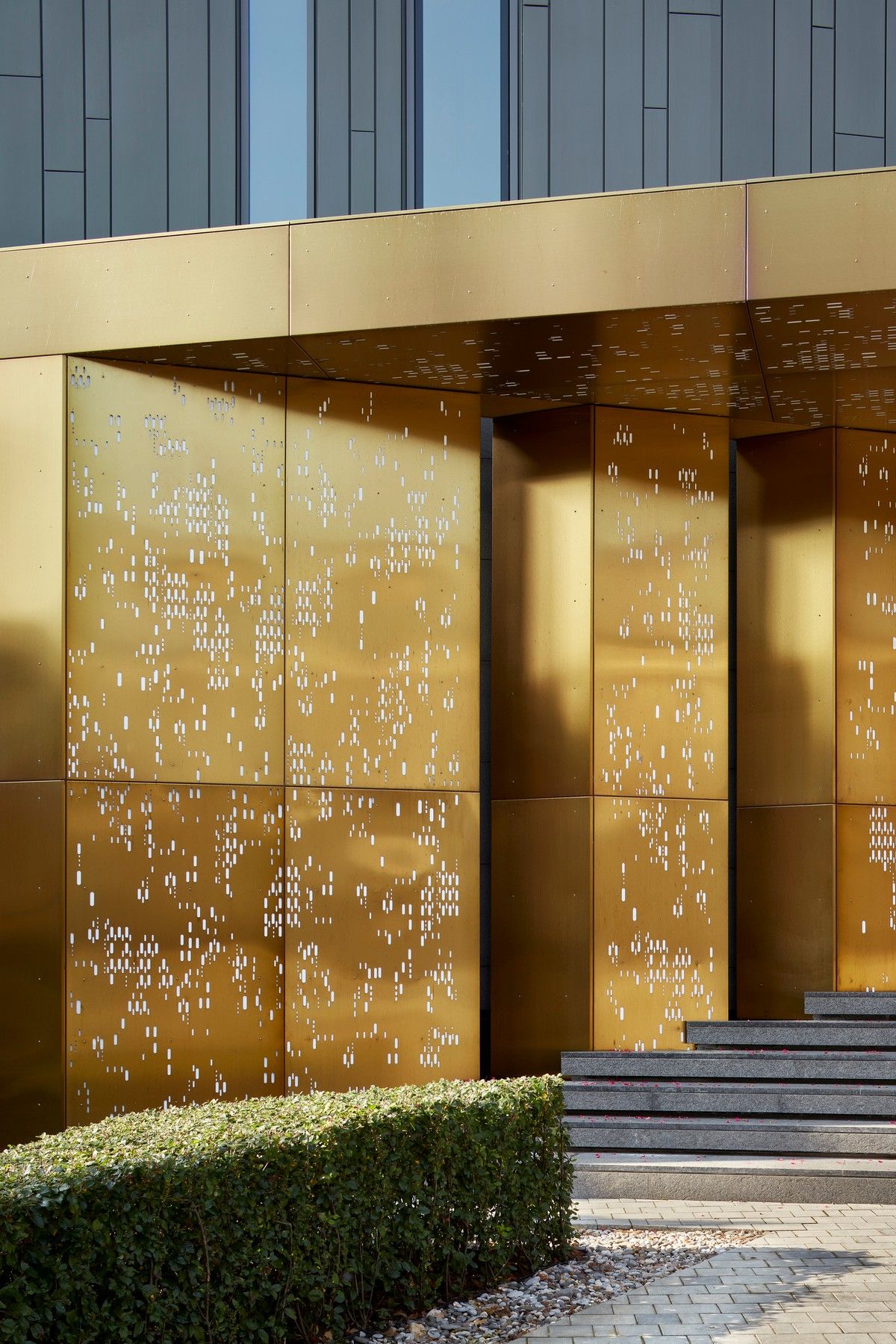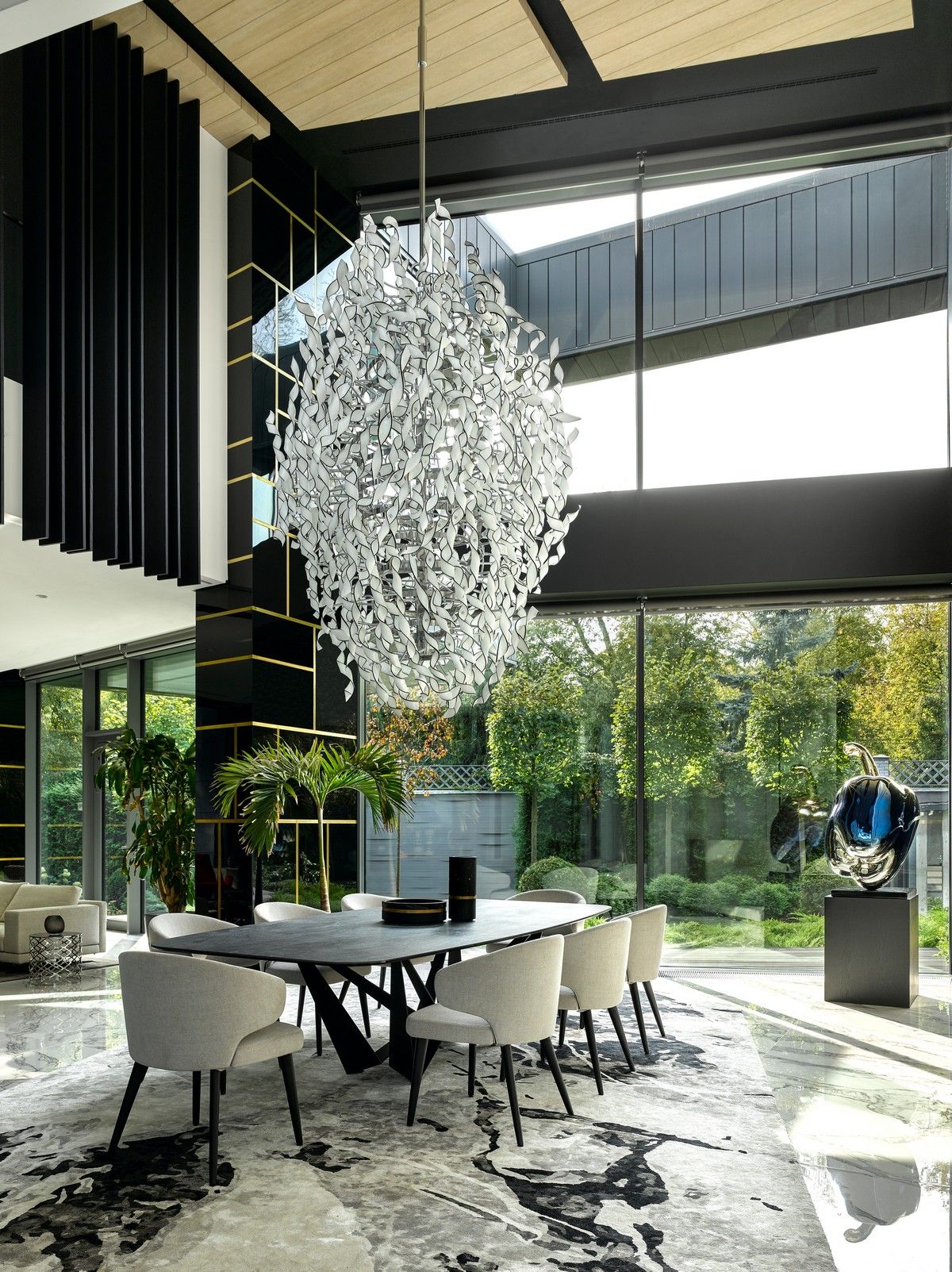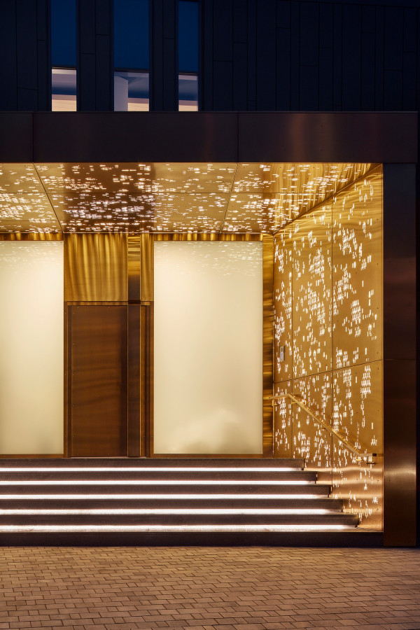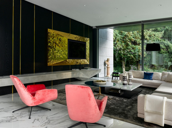 Архитектурная предпосылка представляет собой один из контрастов: мощное защитное присутствие фасада говорит о монолитном архитектурном характере столицы, построенном, чтобы противостоять крайностям жары и холода, которые могут варьироваться в зависимости от сезона на 70 градусов. Таким образом, общественный характер дома даёт современную интерпретацию архитектурного облика города. Главный вход окружен скульптурной композицией. Этот бронзовый фасад с подсветкой не только действует как визуальный сигнал к входному проёу на относительно невыразительном фасаде, но также передаёт обещание роскоши и света интерьеров в частных помещениях за порогом. Это усиливает впечатления от перехода из публичной сферы в частную с преобладающим лесным ландшафтом.Со стороны сада архитектура представляет собой контрастный фасад. Открытые стеклянные стены формируют вид на сосны изнутри, стирая разницу между "внутри" или "снаружи". Открытые террасы и гранёный угловой фасад создают дворы и внешние помещения, которые способствуют взаимодействию ландшафта и архитектуры, что является отходом от местных традиций. В летние месяцы можно жить на улице, как в Южной Африке или Калифорнии. Зимой интерьеры, которые, тем не менее, тёплые и уютные, могут воспевать красоту снежного пейзажа и сосен в совершенно новом подходе к суровым условиям. Даже зимой в центре внимания остается терраса, а не камин. SAOTA использовала серебристо-серо-металлическую облицовку экстерьера, которая дополняет и подчёркивает зелень растений и деревьев в окружающем лесу, обеспечивая захватывающий пейзаж. Фасад сам по себе выполнен из натурального материала, подчеркивая качество изготовления на заказ в деталях, что говорит об уникальном индивидуальном подходе к дизайну и меблировке дома, особенно в дизайне интерьера.Тяжёлые, защитные свойства фасада, особенно уличного, уступают место тёплому, живому интерьеру, как внешняя оболочка жеоды может открывать теплый агат или мерцающий хрустальный интерьер. Он придаёт изысканное, ювелирное качество интерьеру, который отличается от внешнего вида и кажется несколько причудливым и игривым. Внутри преобладают натуральные материалы, от экзотического мрамора с подсветкой до металлических и деревянных поверхностей, которые придают мягкость и тепло. Закрученная скульптурная лестница игриво контрастирует с угловатыми архитектурными элементами, где они сходятся, решая их в органическом цвете и сигнализируя о тонком изменении характера между более общедоступным жилым пространством на первом уровне и спальнями наверху.
