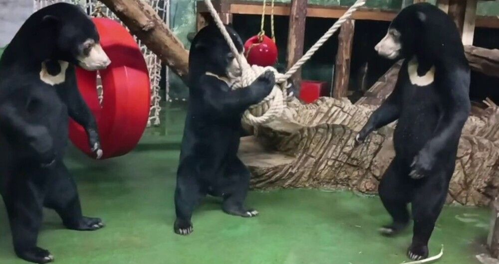 Сперва медведи настороженно отнеслись к игрушке. Однако детское любопытство быстро взяло верх.