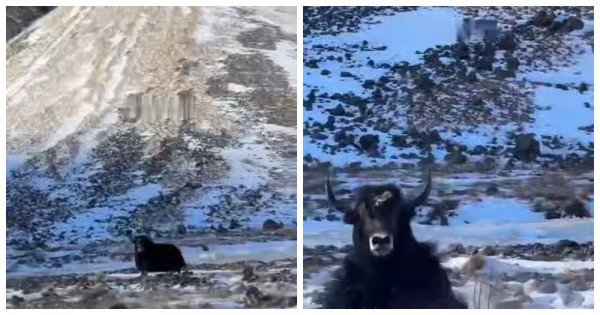 На видео запечатлён момент, как як собирался таранить новенький автомобиль, но внезапно остановился, услышав громкий крик владельца.