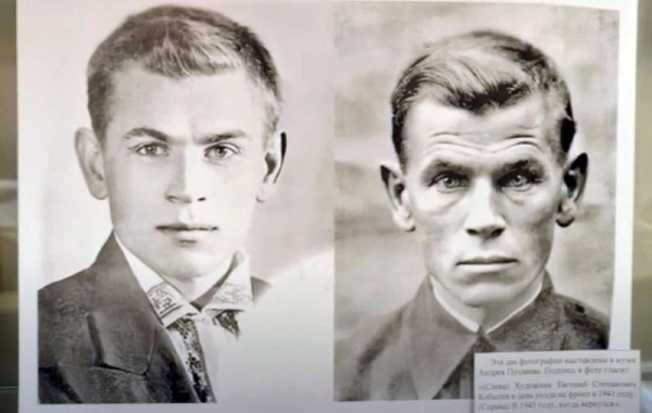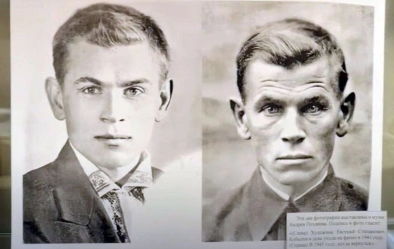 Человека на фотографиях зовут Евгений Степанович Кобытев. Художник, выпускник Омского художественного училища. В 1941 году, когда ему было 30 лет, он сам явился в военкомат и ушел на фронт. Осенью того же года был ранен, попал в плен и оказался в концлагере в городе Хорол под Полтавой. Заключенных там держали в огромной яме под открытым небом: без воды, без медицинской помощи. Тысячи людей умерли от голода, болезней и побоев. Кобытев выжил и в 1943 году бежал, добрался до своих и снова вернулся на фронт. С боями он прошел через Украину, Молдову, Польшу, Германию. Победу встретил в Дрездене.После войны он вернулся к тому, что умел лучше всего, - к живописи. Работал в Красноярске, преподавал, писал портреты, пейзажи, жанровые сцены. Его картины выставлялись в музеях, а сам он стал одним из заметных художников региона.Спустя годы семья Кобытева сохранила многое из того, что сопровождало его военную биографию - письма, рисунки, фотографии. Среди них были и два портрета, сделанные им в 1941‑м и 1945‑м. Дочь художника передала их в школьный музей Красноярска, где они долгие годы незаметно были частью небольшой экспозиции о фронтовиках. Пока однажды кто‑то из посетителей не сфотографировал эти снимки и не выложил их в сеть.Так два портрета, тихо существовавшие в региональном музее, оказались в Reddit, Twitter, рекомендациях Instagram* и TikTok - и вдруг стали документом, который объясняет войну лучше, чем многие мемуары и фильмы. Четыре года, не рассказанные словами, не показанные сценами боев, не разложенные по датам и операциям, просто видны в глазах, в лице, в том, как человек смотрит на мир. И в этом молчаливом контрасте - вся правда о том, что война делает с теми, кто проходит через нее.