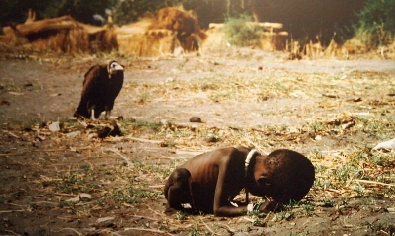 Девочка и стервятникМаленькая девочка лежит на земле, свернувшись в позе эмбриона. Ноги тонкие, как прутья, руки спрятаны под грудью, голова опущена, кожа обтягивает выпирающие ребра. В нескольких шагах позади сидит стервятник. Он не приближается - просто ждет. И этого ожидания достаточно, чтобы кадр стал символом голода, охватившего Судан в 1993 году.
