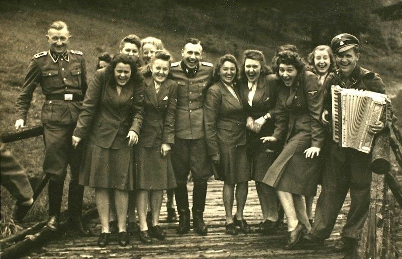 Персонал Освенцима на отдыхеНа первый взгляд - обычная летняя фотография. Деревянный мостик над ручьем, мягкий свет. Тринадцать человек стоят плотной группой, будто только что кто‑то сказал: "Ну что, снимок на память?" Они улыбаются и смеются - искренне, по‑дружески. Один держит аккордеон, другой чуть наклонился вперед, будто готов выдать еще одну шутку.