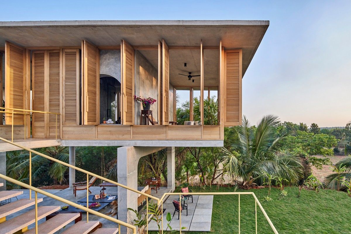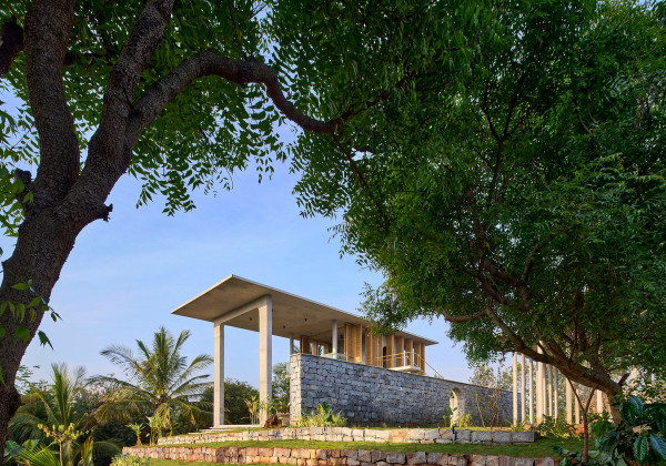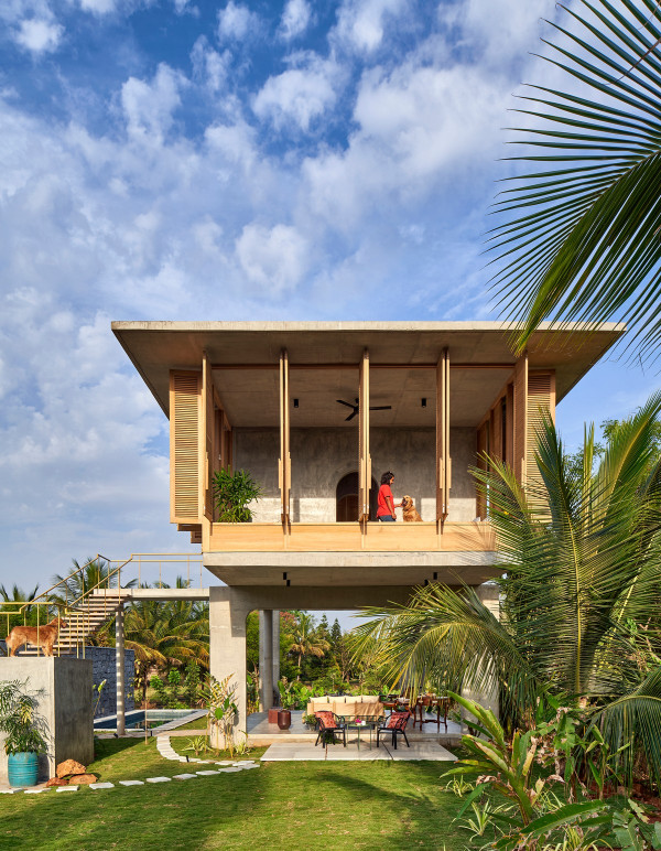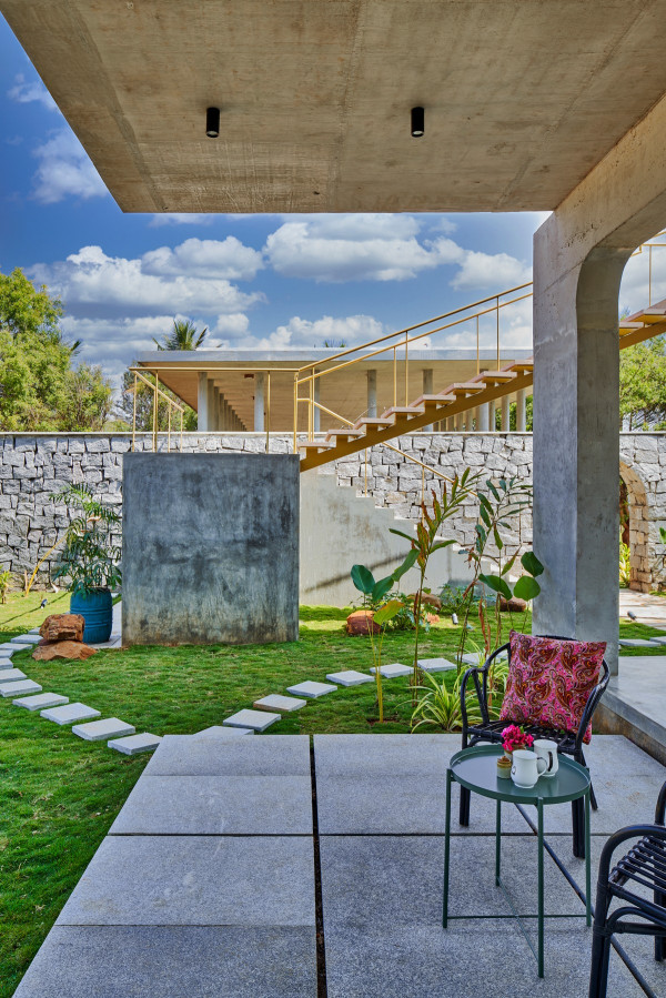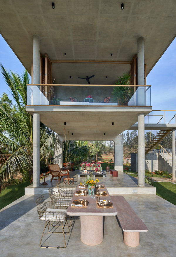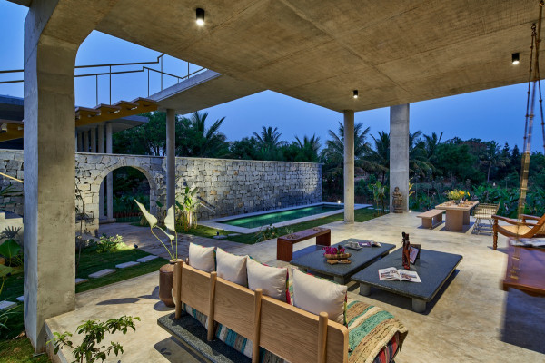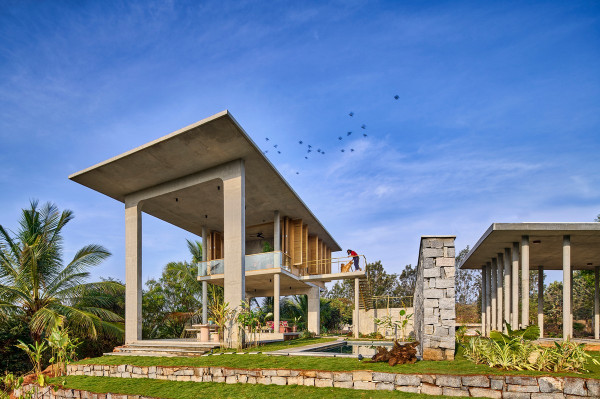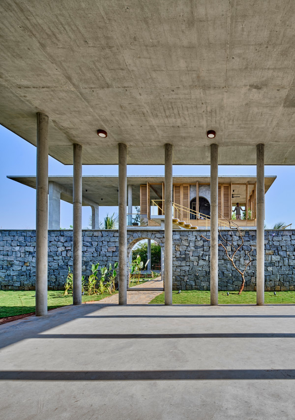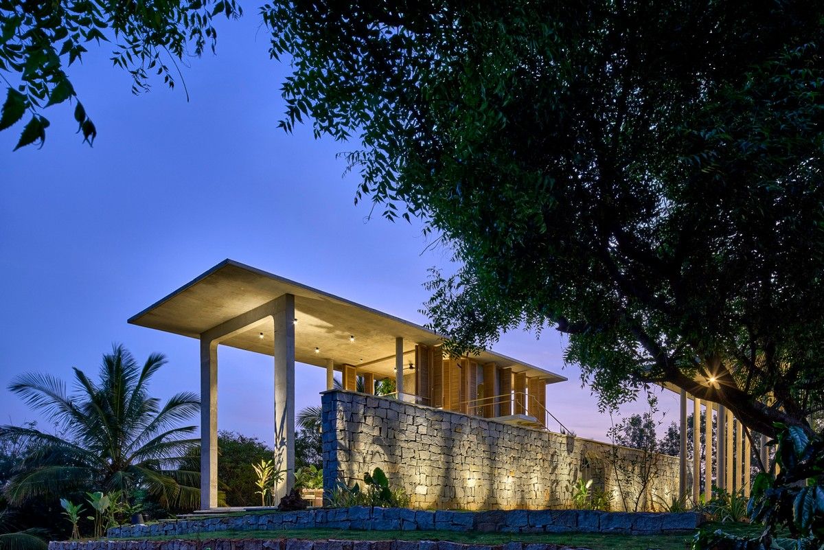 Проект площадью 487 квадратных метров представляет собой несколько объемов со множеством открытых пространств, которые существуют как одно целое на участке, занимающем площадь 1,62 гектара. На самом высоком уровне участка возведен главный двухэтажный дом с подвалом. Верхний этаж опирается на бетонные столбы, образуя широкий пролет с глубоким свесом. Полностью открытый первый этаж занимает общественное пространство открытого плана - гостиная, столовая и зона отдыха. Для оформления пространства были использованы переработанное дерево и местный камень. Старинные артефакты делают интерьер особенно интересным и индивидуальным. Гостиная плавно переходит в обеденную зону с каменной столешницей и скамейкой, которые изготовлены из местного розового камня Magadi.На втором этаже оборудована главная спальня с отдельной ванной комнатой и кабинетом. Арочные элементы дополняют линейность конструкции, а высокие дубовые ставни по периметру во всю высоту помещений создают надежную защиту от яркого солнечного света, в то же время, позволяют естественному свету проникать внутрь помещений.Этажи дома соединены элегантной внешней лестницей, рядом с которой на нижнем этаже находится бассейн с каменной стеной на заднем плане. Бассейн ловит северо-восточный бриз, что делает его идеальным местом для отдыха. Рядом с главным домом построен многофункциональный павильон длиной 24,4 метров с круглыми колоннами по всему периметру. Когда высаженные вокруг павильона деревья вырастут до максимальной высоты, будет создана "живая" изгородь, и столбы будут полностью закрыты зеленью. Павильон предназначен для проведения разнообразных мероприятий с приглашением большого количества людей. Это идеальное место для музыкальных вечеринок, театральных спектаклей, танцевальных представлений. Павильон открыт для местных жителей. Так, во время пандемии, он использовался в качестве класса для местной школы.Материалы для проекта выбирались с учетом их качества и долговечности. Палитра натуральных материалов - бетон, древесина дуба и камни, добытые в местных карьерах, среди которых Sadarahalli и розовый Magadi, придает дому особенный шарм. Со временем эти материалы будут стареть и покрываться патиной, что позволит строениям полностью слиться с окружающей природой.Выработка электроэнергии для жизнеобеспечения здания осуществляется солнечными панелями. Чтобы снизить потребность в механическом кондиционировании воздуха, вместо оградительных конструкций в проекте предусмотрены возможности естественной природы. Так, традиционные стены в проекте заменены на "живые" ограждения из деревьев и растений, способные снизить температуру в помещении на 4 градуса, а также обеспечить более качественную циркуляцию воздуха. Дизайн бассейна позволяет улавливать потоки ветра, а также способствует испарительному охлаждению и созданию комфортного микроклимата на территории двора. Каменные стены и окружающий грунт круглый год остаются прохладными, что также способствует созданию благоприятной для отдыха температуры.