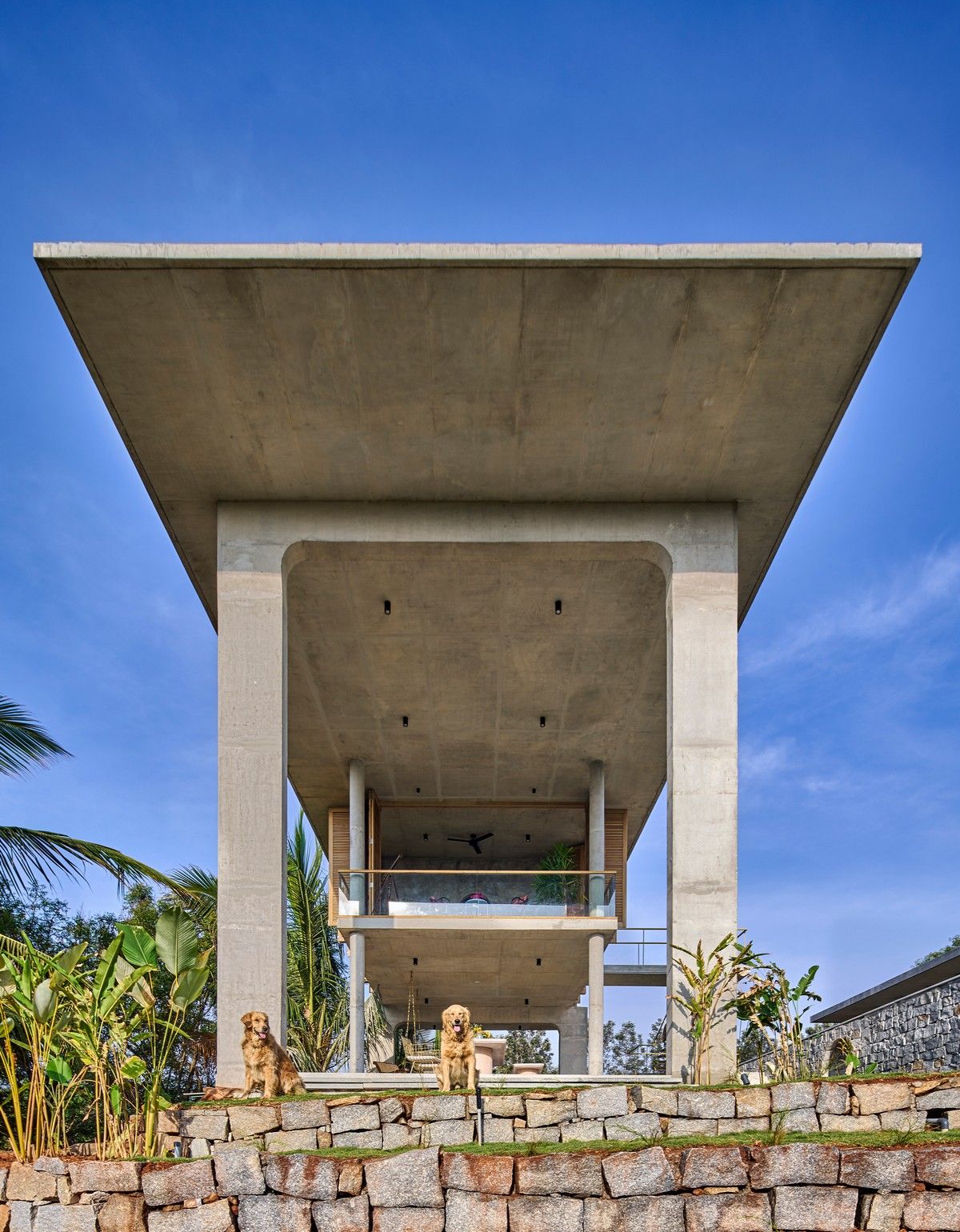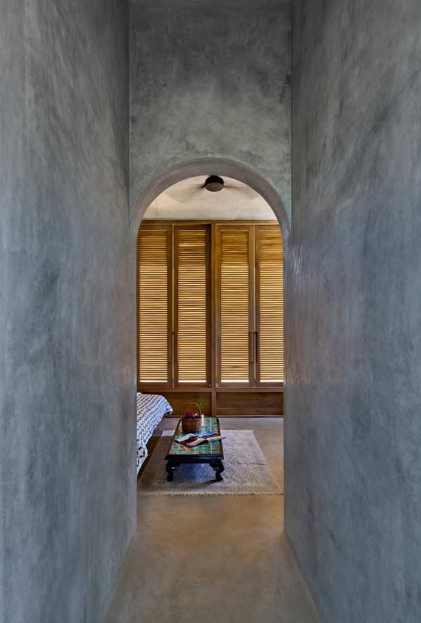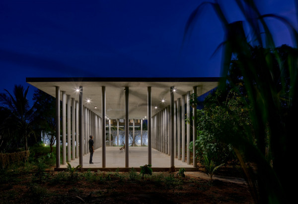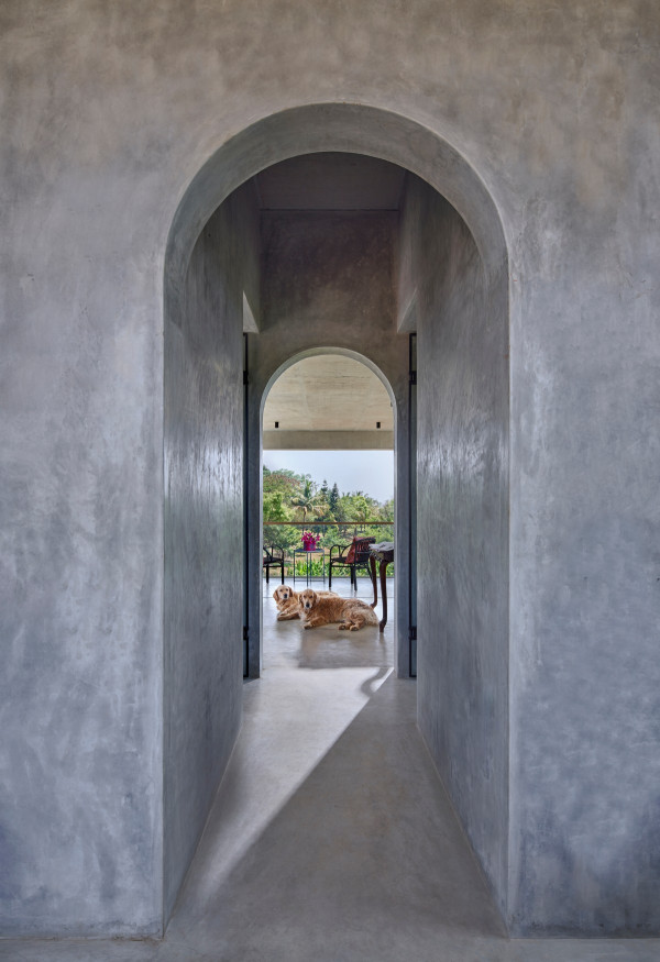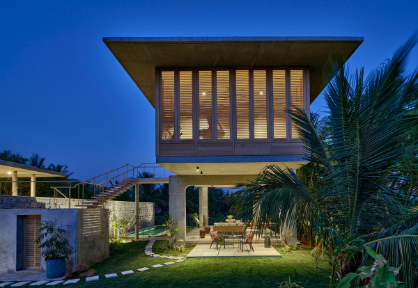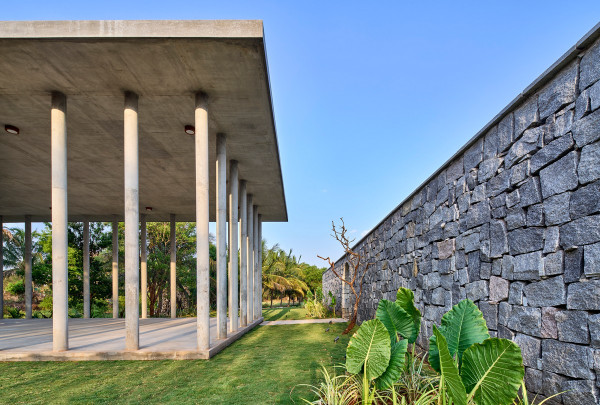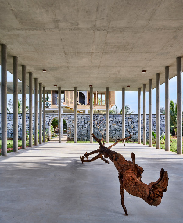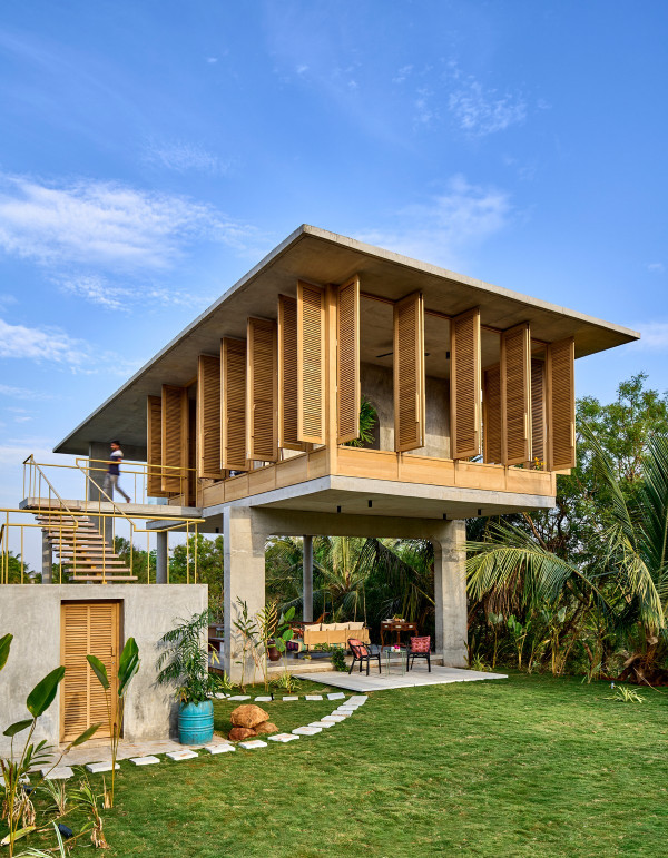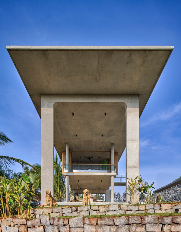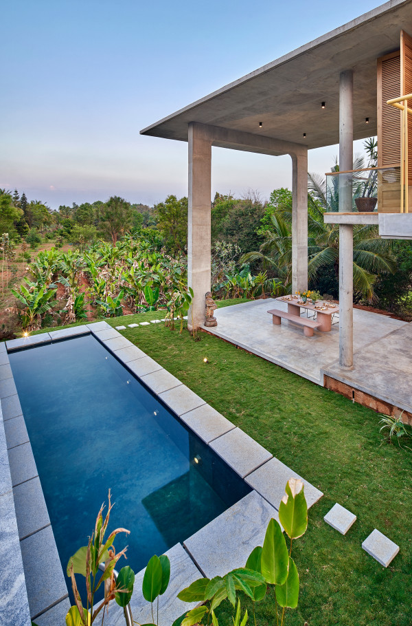 Проект площадью 487 квадратных метров представляет собой несколько объемов со множеством открытых пространств, которые существуют как одно целое на участке, занимающем площадь 1,62 гектара. На самом высоком уровне участка возведен главный двухэтажный дом с подвалом. Верхний этаж опирается на бетонные столбы, образуя широкий пролет с глубоким свесом. Полностью открытый первый этаж занимает общественное пространство открытого плана - гостиная, столовая и зона отдыха. Для оформления пространства были использованы переработанное дерево и местный камень. Старинные артефакты делают интерьер особенно интересным и индивидуальным. Гостиная плавно переходит в обеденную зону с каменной столешницей и скамейкой, которые изготовлены из местного розового камня Magadi.На втором этаже оборудована главная спальня с отдельной ванной комнатой и кабинетом. Арочные элементы дополняют линейность конструкции, а высокие дубовые ставни по периметру во всю высоту помещений создают надежную защиту от яркого солнечного света, в то же время, позволяют естественному свету проникать внутрь помещений.Этажи дома соединены элегантной внешней лестницей, рядом с которой на нижнем этаже находится бассейн с каменной стеной на заднем плане. Бассейн ловит северо-восточный бриз, что делает его идеальным местом для отдыха. Рядом с главным домом построен многофункциональный павильон длиной 24,4 метров с круглыми колоннами по всему периметру. Когда высаженные вокруг павильона деревья вырастут до максимальной высоты, будет создана "живая" изгородь, и столбы будут полностью закрыты зеленью. Павильон предназначен для проведения разнообразных мероприятий с приглашением большого количества людей. Это идеальное место для музыкальных вечеринок, театральных спектаклей, танцевальных представлений. Павильон открыт для местных жителей. Так, во время пандемии, он использовался в качестве класса для местной школы.Материалы для проекта выбирались с учетом их качества и долговечности. Палитра натуральных материалов - бетон, древесина дуба и камни, добытые в местных карьерах, среди которых Sadarahalli и розовый Magadi, придает дому особенный шарм. Со временем эти материалы будут стареть и покрываться патиной, что позволит строениям полностью слиться с окружающей природой.Выработка электроэнергии для жизнеобеспечения здания осуществляется солнечными панелями. Чтобы снизить потребность в механическом кондиционировании воздуха, вместо оградительных конструкций в проекте предусмотрены возможности естественной природы. Так, традиционные стены в проекте заменены на "живые" ограждения из деревьев и растений, способные снизить температуру в помещении на 4 градуса, а также обеспечить более качественную циркуляцию воздуха. Дизайн бассейна позволяет улавливать потоки ветра, а также способствует испарительному охлаждению и созданию комфортного микроклимата на территории двора. Каменные стены и окружающий грунт круглый год остаются прохладными, что также способствует созданию благоприятной для отдыха температуры.