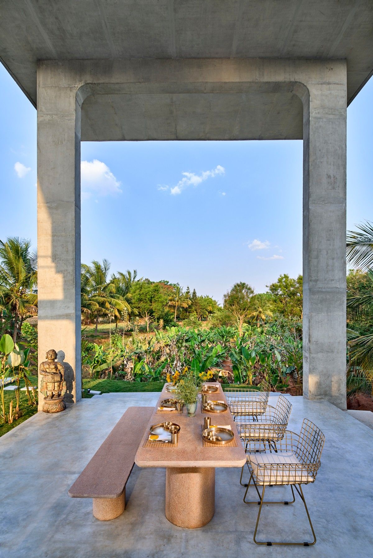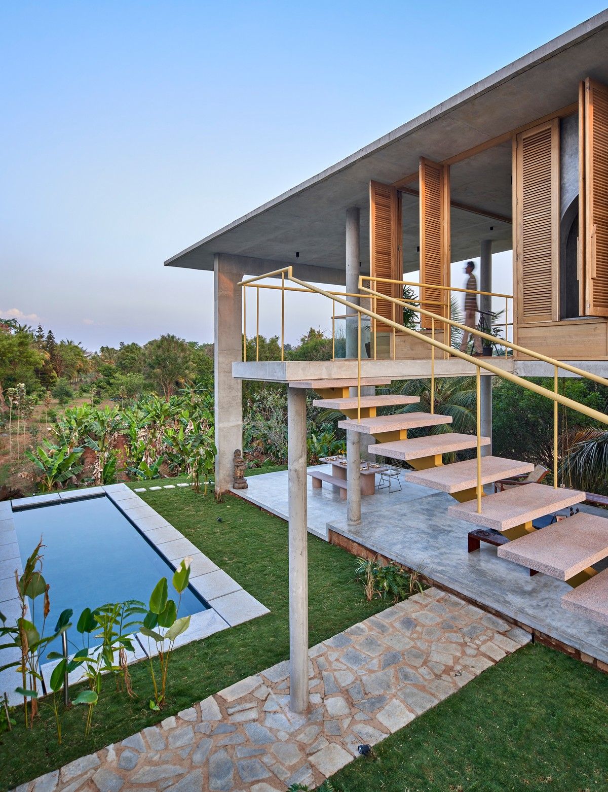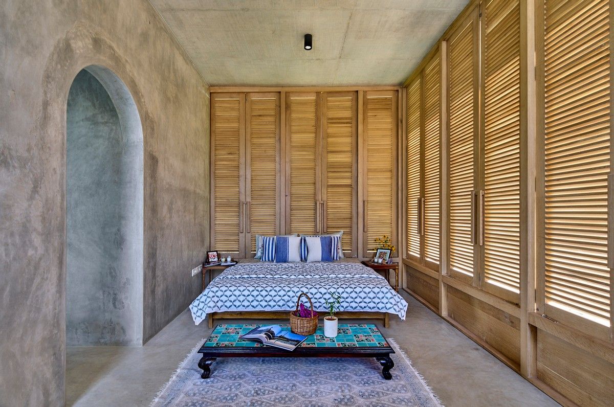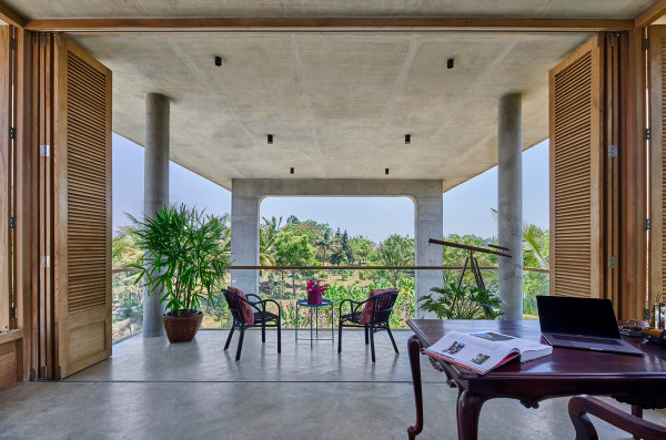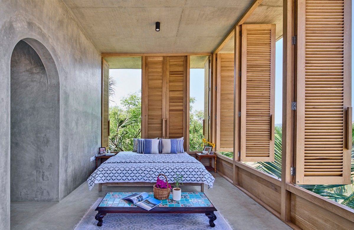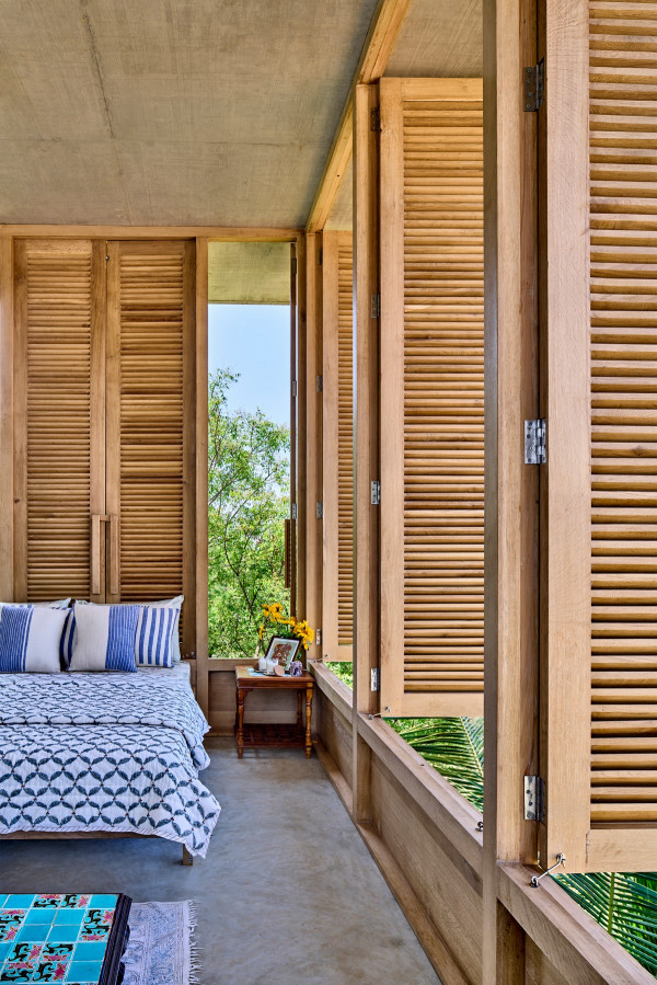 Проект площадью 487 квадратных метров представляет собой несколько объемов со множеством открытых пространств, которые существуют как одно целое на участке, занимающем площадь 1,62 гектара. На самом высоком уровне участка возведен главный двухэтажный дом с подвалом. Верхний этаж опирается на бетонные столбы, образуя широкий пролет с глубоким свесом. Полностью открытый первый этаж занимает общественное пространство открытого плана - гостиная, столовая и зона отдыха. Для оформления пространства были использованы переработанное дерево и местный камень. Старинные артефакты делают интерьер особенно интересным и индивидуальным. Гостиная плавно переходит в обеденную зону с каменной столешницей и скамейкой, которые изготовлены из местного розового камня Magadi.На втором этаже оборудована главная спальня с отдельной ванной комнатой и кабинетом. Арочные элементы дополняют линейность конструкции, а высокие дубовые ставни по периметру во всю высоту помещений создают надежную защиту от яркого солнечного света, в то же время, позволяют естественному свету проникать внутрь помещений.Этажи дома соединены элегантной внешней лестницей, рядом с которой на нижнем этаже находится бассейн с каменной стеной на заднем плане. Бассейн ловит северо-восточный бриз, что делает его идеальным местом для отдыха. Рядом с главным домом построен многофункциональный павильон длиной 24,4 метров с круглыми колоннами по всему периметру. Когда высаженные вокруг павильона деревья вырастут до максимальной высоты, будет создана "живая" изгородь, и столбы будут полностью закрыты зеленью. Павильон предназначен для проведения разнообразных мероприятий с приглашением большого количества людей. Это идеальное место для музыкальных вечеринок, театральных спектаклей, танцевальных представлений. Павильон открыт для местных жителей. Так, во время пандемии, он использовался в качестве класса для местной школы.Материалы для проекта выбирались с учетом их качества и долговечности. Палитра натуральных материалов - бетон, древесина дуба и камни, добытые в местных карьерах, среди которых Sadarahalli и розовый Magadi, придает дому особенный шарм. Со временем эти материалы будут стареть и покрываться патиной, что позволит строениям полностью слиться с окружающей природой.Выработка электроэнергии для жизнеобеспечения здания осуществляется солнечными панелями. Чтобы снизить потребность в механическом кондиционировании воздуха, вместо оградительных конструкций в проекте предусмотрены возможности естественной природы. Так, традиционные стены в проекте заменены на "живые" ограждения из деревьев и растений, способные снизить температуру в помещении на 4 градуса, а также обеспечить более качественную циркуляцию воздуха. Дизайн бассейна позволяет улавливать потоки ветра, а также способствует испарительному охлаждению и созданию комфортного микроклимата на территории двора. Каменные стены и окружающий грунт круглый год остаются прохладными, что также способствует созданию благоприятной для отдыха температуры.