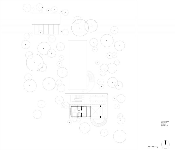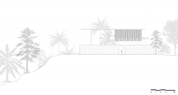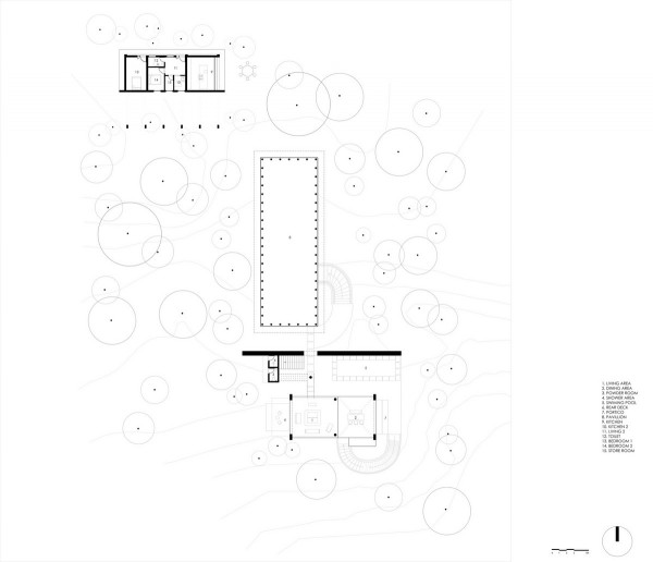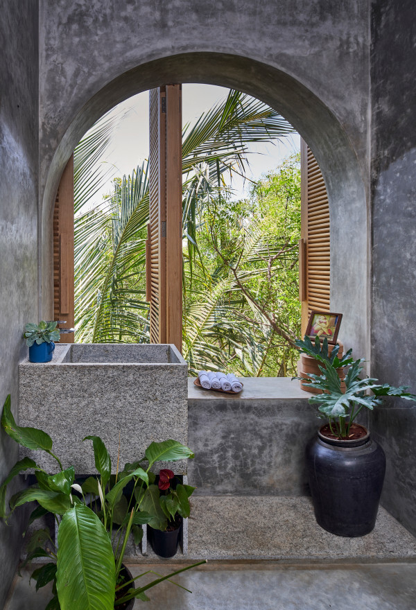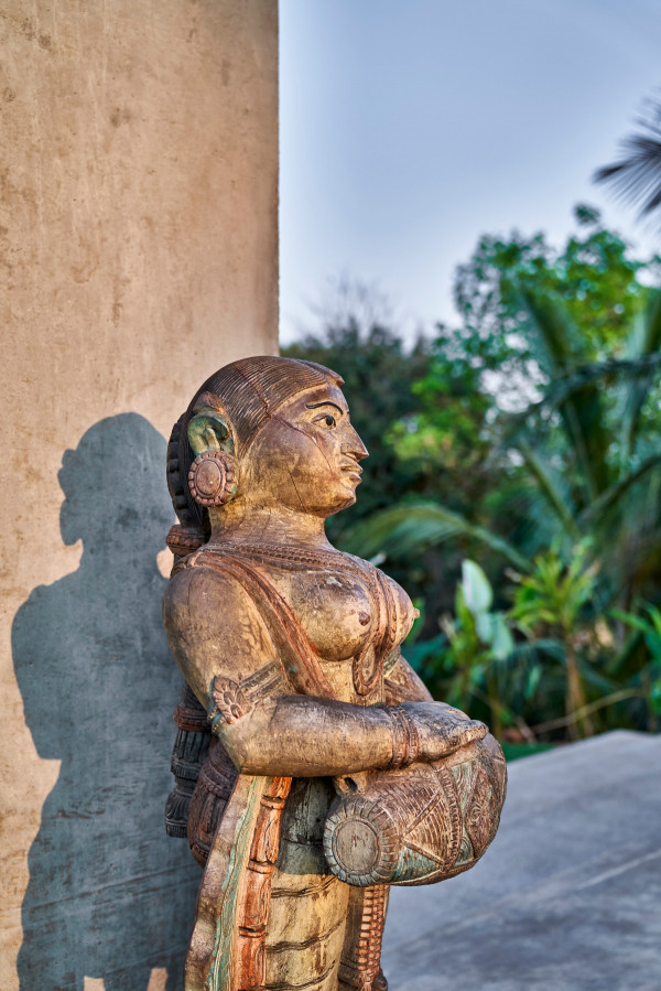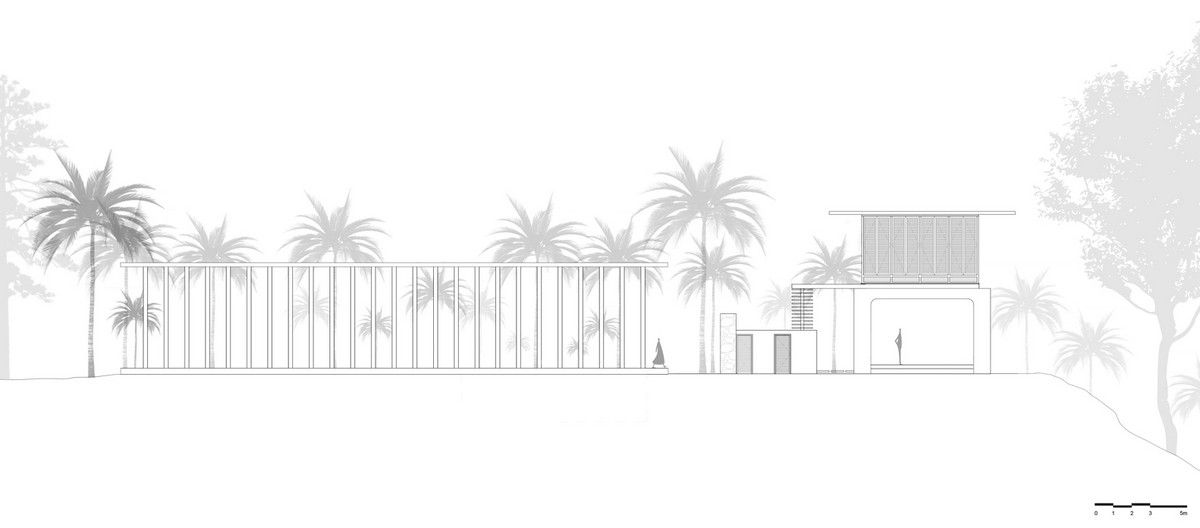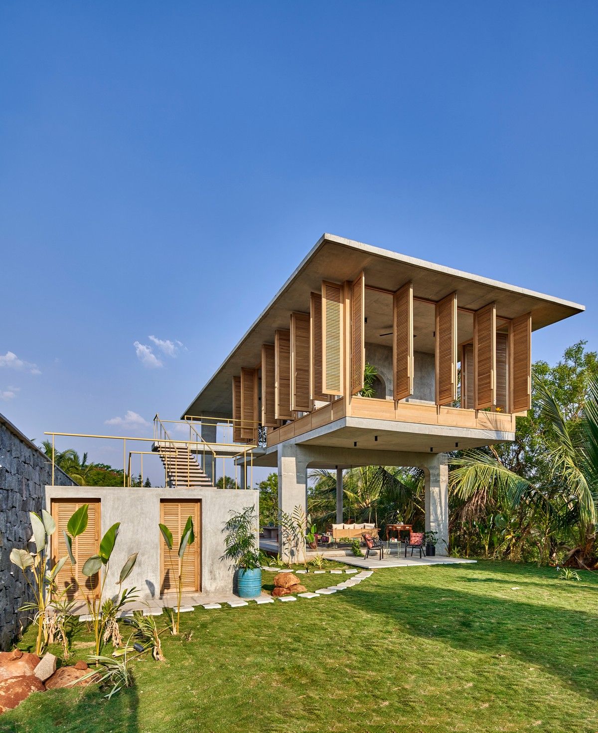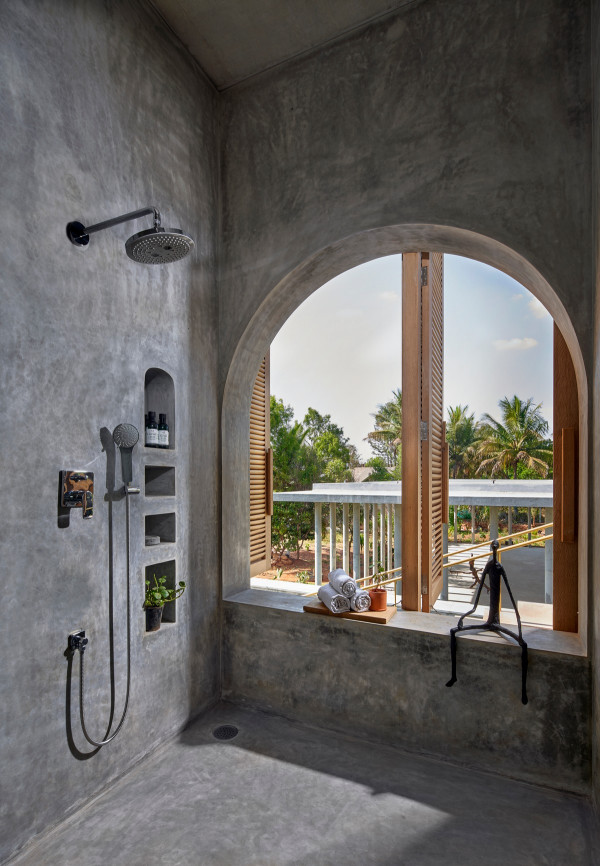 Проект площадью 487 квадратных метров представляет собой несколько объемов со множеством открытых пространств, которые существуют как одно целое на участке, занимающем площадь 1,62 гектара. На самом высоком уровне участка возведен главный двухэтажный дом с подвалом. Верхний этаж опирается на бетонные столбы, образуя широкий пролет с глубоким свесом. Полностью открытый первый этаж занимает общественное пространство открытого плана - гостиная, столовая и зона отдыха. Для оформления пространства были использованы переработанное дерево и местный камень. Старинные артефакты делают интерьер особенно интересным и индивидуальным. Гостиная плавно переходит в обеденную зону с каменной столешницей и скамейкой, которые изготовлены из местного розового камня Magadi.На втором этаже оборудована главная спальня с отдельной ванной комнатой и кабинетом. Арочные элементы дополняют линейность конструкции, а высокие дубовые ставни по периметру во всю высоту помещений создают надежную защиту от яркого солнечного света, в то же время, позволяют естественному свету проникать внутрь помещений.Этажи дома соединены элегантной внешней лестницей, рядом с которой на нижнем этаже находится бассейн с каменной стеной на заднем плане. Бассейн ловит северо-восточный бриз, что делает его идеальным местом для отдыха. Рядом с главным домом построен многофункциональный павильон длиной 24,4 метров с круглыми колоннами по всему периметру. Когда высаженные вокруг павильона деревья вырастут до максимальной высоты, будет создана "живая" изгородь, и столбы будут полностью закрыты зеленью. Павильон предназначен для проведения разнообразных мероприятий с приглашением большого количества людей. Это идеальное место для музыкальных вечеринок, театральных спектаклей, танцевальных представлений. Павильон открыт для местных жителей. Так, во время пандемии, он использовался в качестве класса для местной школы.Материалы для проекта выбирались с учетом их качества и долговечности. Палитра натуральных материалов - бетон, древесина дуба и камни, добытые в местных карьерах, среди которых Sadarahalli и розовый Magadi, придает дому особенный шарм. Со временем эти материалы будут стареть и покрываться патиной, что позволит строениям полностью слиться с окружающей природой.Выработка электроэнергии для жизнеобеспечения здания осуществляется солнечными панелями. Чтобы снизить потребность в механическом кондиционировании воздуха, вместо оградительных конструкций в проекте предусмотрены возможности естественной природы. Так, традиционные стены в проекте заменены на "живые" ограждения из деревьев и растений, способные снизить температуру в помещении на 4 градуса, а также обеспечить более качественную циркуляцию воздуха. Дизайн бассейна позволяет улавливать потоки ветра, а также способствует испарительному охлаждению и созданию комфортного микроклимата на территории двора. Каменные стены и окружающий грунт круглый год остаются прохладными, что также способствует созданию благоприятной для отдыха температуры.