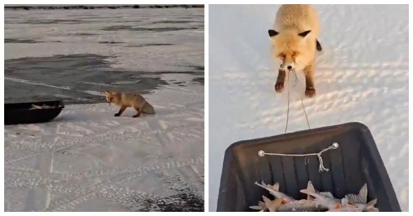 Лиса заметила рыбу у рыбака и не смогла устоять. Схватив верёвку пастью, она тащила добычу по льду, проявляя свою ловкость и хитрость.