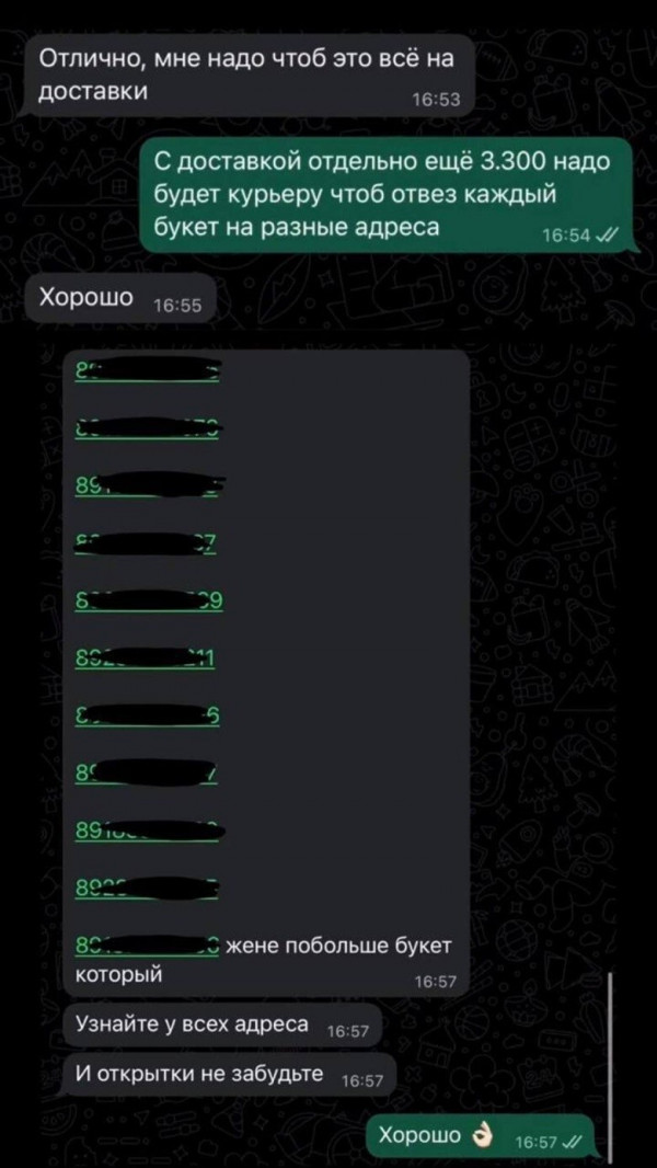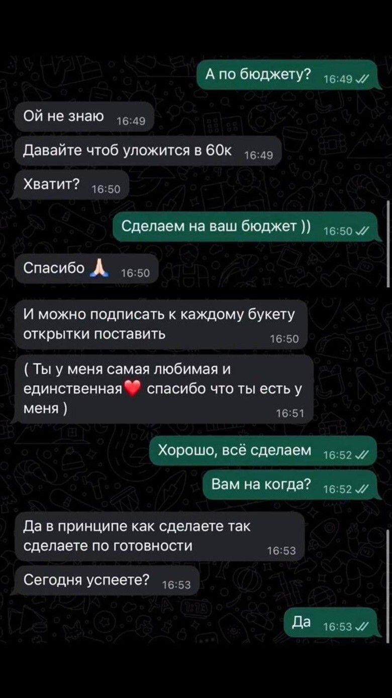 Мужчина потратил 60 тысяч рублей, заказав сразу 11 букетов с абсолютно идентичными открытками: "Ты у меня самая любимая и единственная".Иерархия чувств была соблюдена строго по ГОСТу: самый внушительный веник отправился законной супруге, а остальные десять - "филиалам" его сердца. Стратегия безупречная, если бы не одно "но". Флористы, судя по всему, были в таком восторге от заказа, что не удержались и слили этот "оптовый закуп" в сеть. А вот это уже к вопросу о конфиденциальности в мире, где даже твой букет может стать мемом.