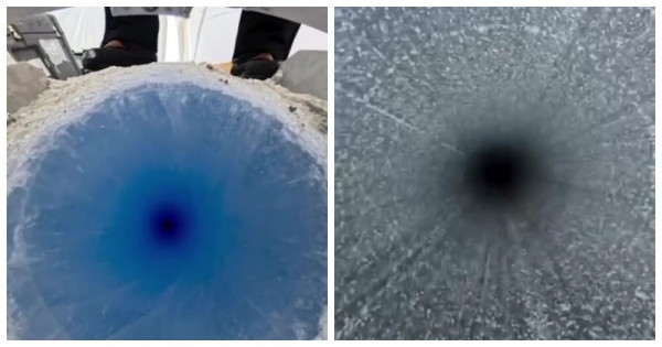 В Антарктиде фотограф отправил камеру вглубь древнего ледника, прикрепив её к буровой установке