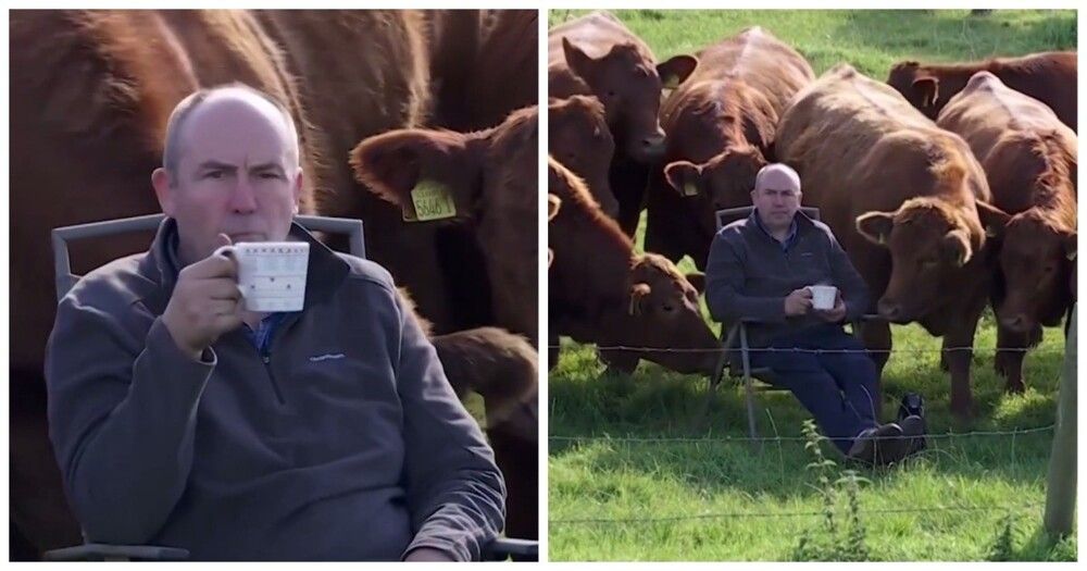 Фермер смотрит чемпионат по гольфу в окружении своих коров.
