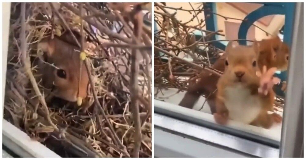 Жители одного из домов заметили необычного соседа. Белка обустроила себе небольшое убежище прямо за их окном.