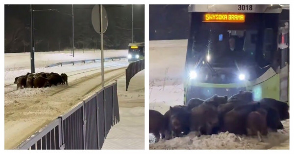 Кабаны решили собраться в одном из городов Польши. Местом встречи они выбрали трамвайные пути в городе Ольштын.