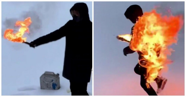 Группа парней решила устроить экстремальное фаер-шоу. План был такой: один из героев видео поджигает себя, бежит по берегу, а затем эффектно ныряет в ледяную воду. Однако план был идеален только на бумаге. Экстремал поскользнулся и непреднамеренно добавил в свой трюк дополнительный элемент.