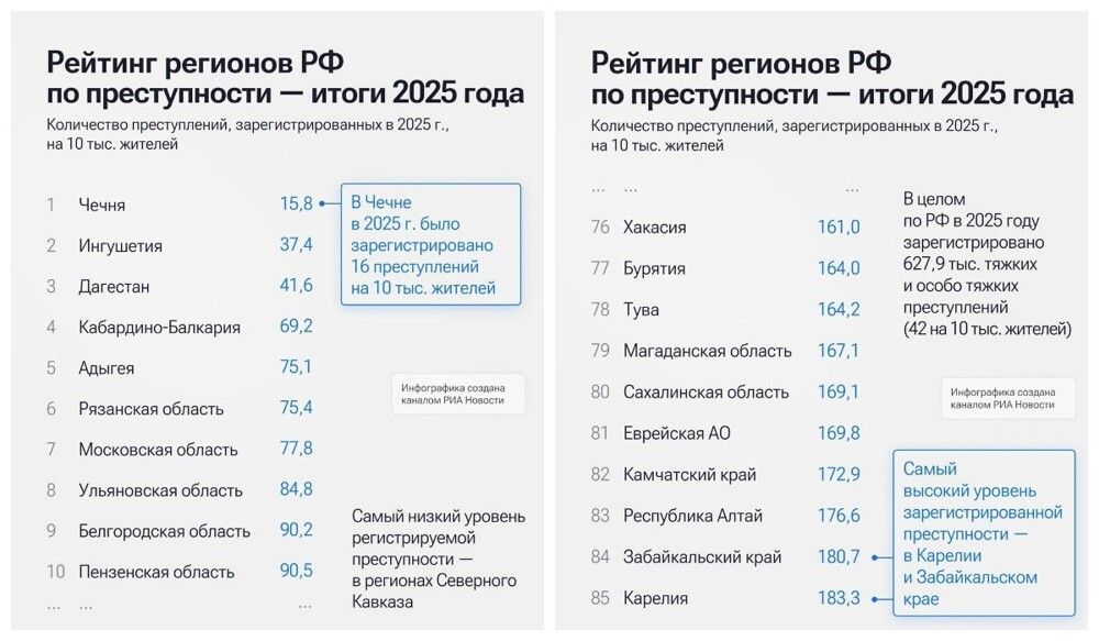 Отмечается, что в Чечне, Ингушетии и Дагестане также было зарегистрировано наименьшее количество тяжких и особо тяжких преступлений. В, к примеру, в прошлом году было совершено всего 5 тяжких и особо тяжких преступлений, что в восемь раз ниже общероссийского уровня. Регионами с самым высоким уровнем преступности стали Алтай (176 преступления), Забайкальский край (180 преступлений) и Карелия (183 преступления). При этом самое большое количество тяжких и особо тяжких преступлений в 2025 году было зафиксировано в Камчатском и Забайкальском крае, а также в Магаданской области.
