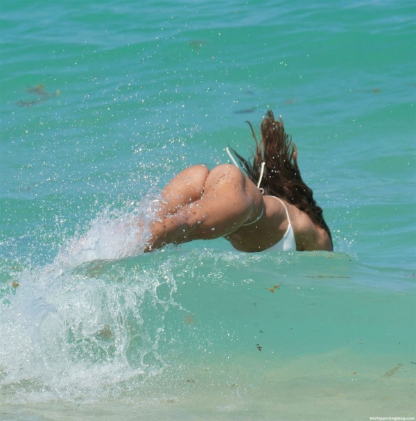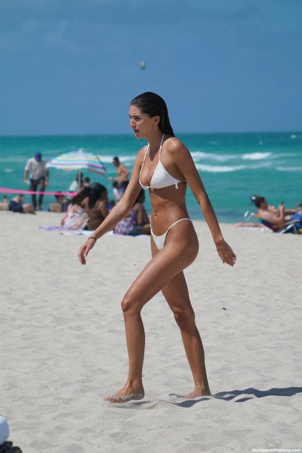 29-летняя американская модель Дебби Сен-Пьер (Debbie St. Pierre) в белом бикини на пляже в Майами-Бич.