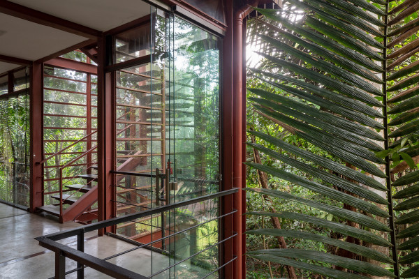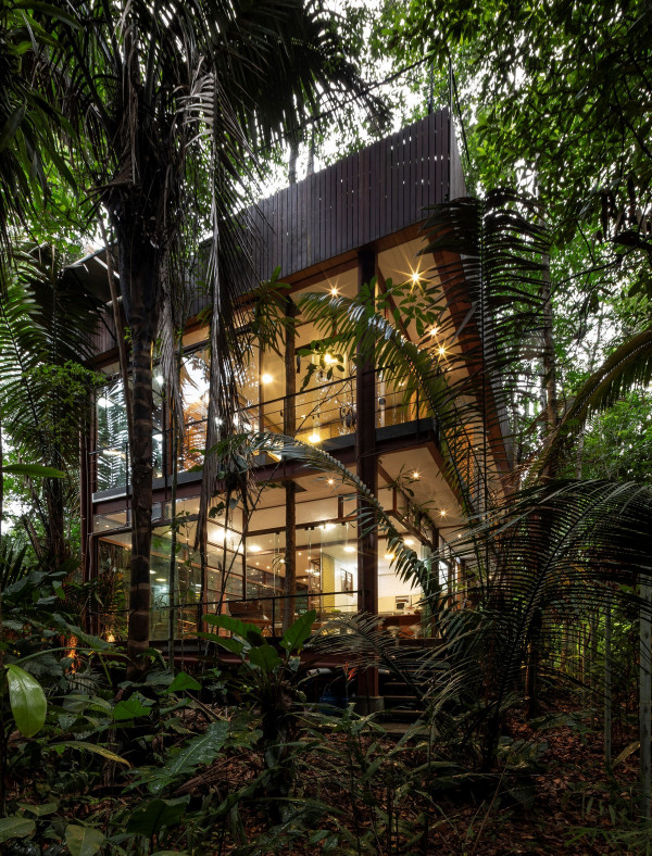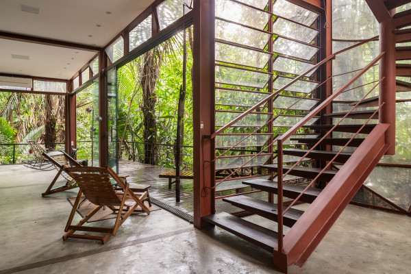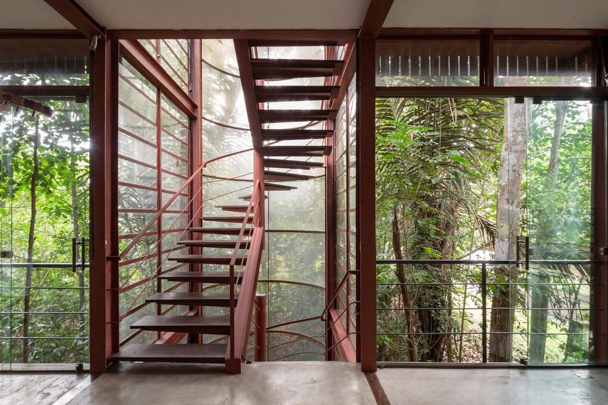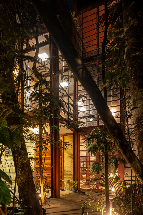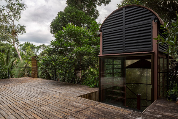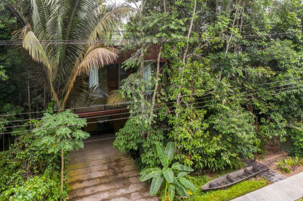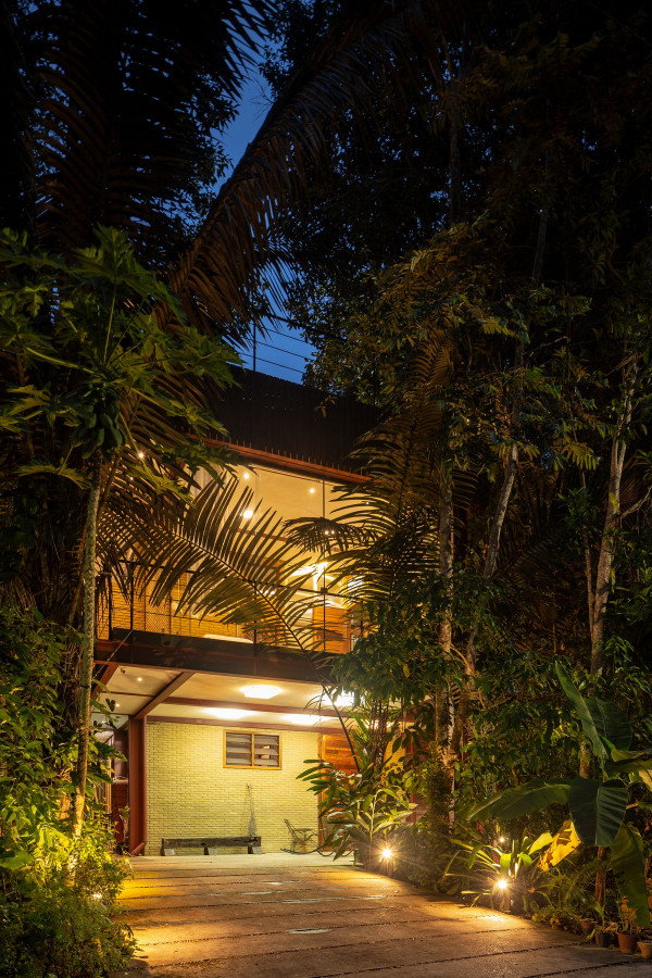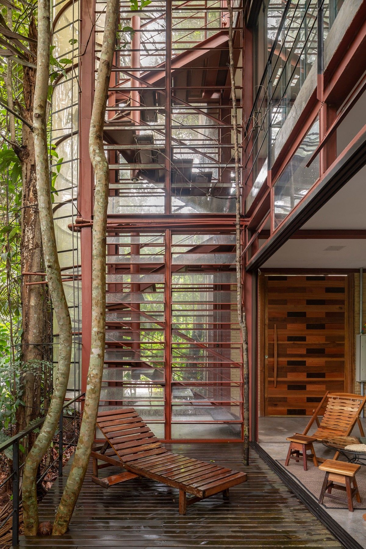 Дом расположен в жилом кондоминиуме в живописном районе Тарума с естественным лесом, ручьями и множеством диких животных. Участок, выделенный под проект, находится на территории сохранившегося посреди городской зоны пышного леса Амазонки, в 25 км от Международного аэропорта имени Эдуарду Гомеша.Основная задача при проектировании и строительстве дома заключалась в максимальном сохранении уникального природного ландшафта и применении естественных процессов вентиляции и освещения здания. С целью отказа от использования тяжелых землеройных машин и сохранения на участке вековых деревьев, выбор был сделан в пользу сборной металлической конструкции объекта, позволяющей соблюсти природоохранные мероприятия.Здание занимает центр участка, где была большая лесная поляна, и выходит на улицу с юго-западной стороны, в то время, как ветер, преимущественно, дует с востока на запад. Конструкция приподнята на сваях на высоте одного метра над естественной местностью, что позволило сохранить корни растущих вокруг деревьев. Пышная зелень тропического леса, плотно окружающая дом, выполняет роль внешних занавесок и обеспечивает необходимую конфиденциальность. Интерьер, оказавшийся "в куполе" буйной зелени, приобретает уникальную характеристику, наполненную природной энергией.Общая площадь двухэтажного дома на одну семью составляет 260 квадратных метров. Первый этаж здания занимает социальная зона открытого плана - гостиная, столовая и кухня. На втором этаже оборудована приватная зона с тремя спальнями и тремя ванными комнатами. На крыше дома оборудована открытая терраса с деревянной палубой и джакузи. Этажи дома соединены панорамной полувинтовой лестницей, которая поднимается вдоль могучих стволов величественных деревьев до террасы, окруженной их пышными кронами. Центральная ось винтовой части лестницы выполнена из 2 металлических труб диаметром 16 см, которые были приобретены на складе по переработке металла в промышленном районе города. Для покрытия лестничной башни была использована часть старого стального желоба диаметром 2,60 метров.Интерьер дома впечатляет естественной простотой и уютом. Часть мебели является эксклюзивной. Для изготовления столешницы для окрашенной стальной конструкции и умывальника была применена древесина уникального дерева ангелим, одного из самых больших деревьев в тропическом лесу, высота которого может достигать50-60 метров, а ствол - 1-1,8 метров в диаметре.